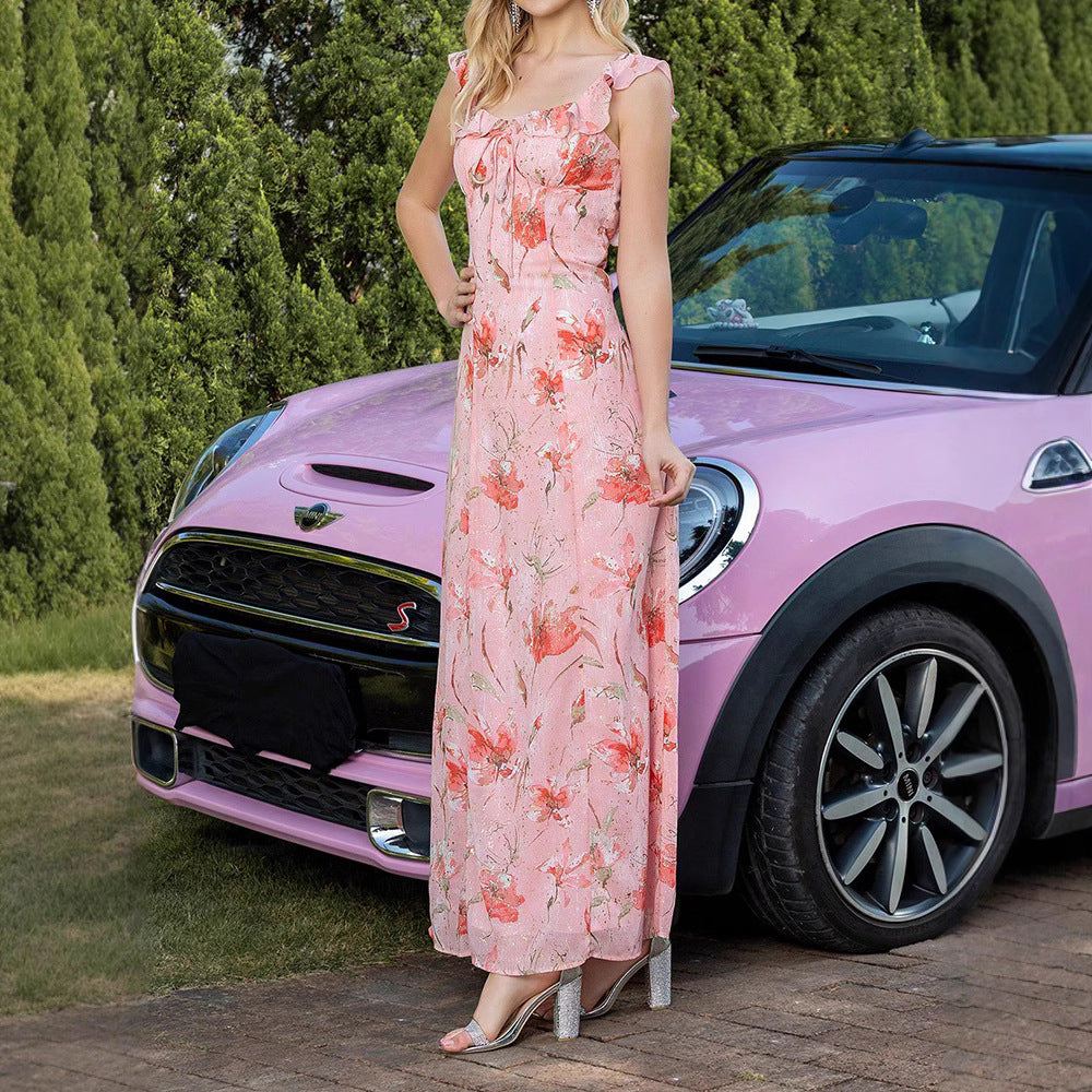 This spring dress features a floral print with a high waist and a large swing skirt that creates a flowing silhouette. The sleeveless, backless design includes a lace-up back detail, adding a modern element to the overall look. Its lightweight construction makes it suitable for outdoor and formal occasions throughout the season. Available in sizes S to XL, it offers a tailored fit for different body types.