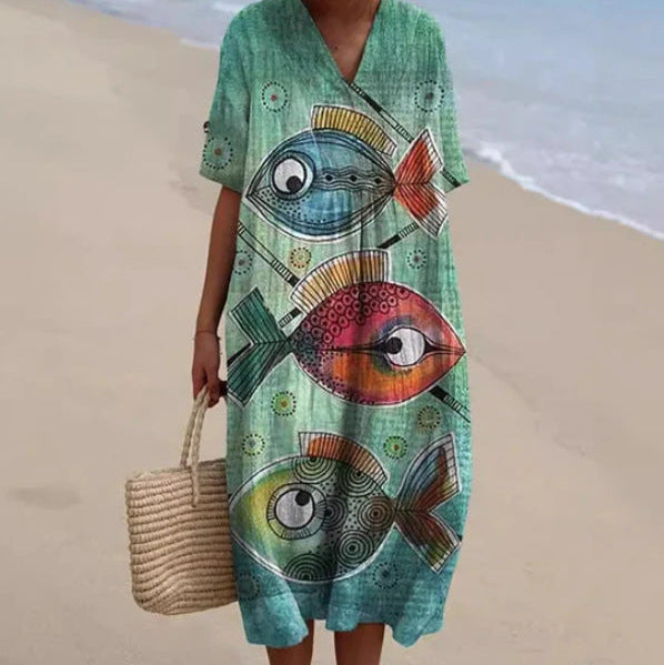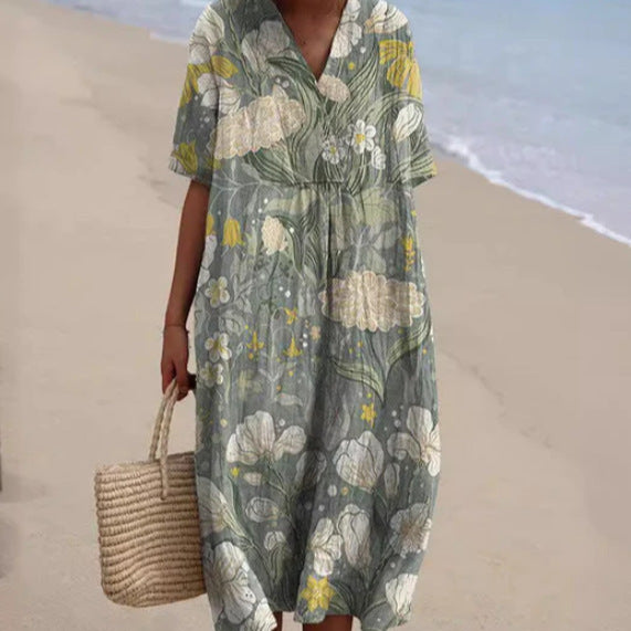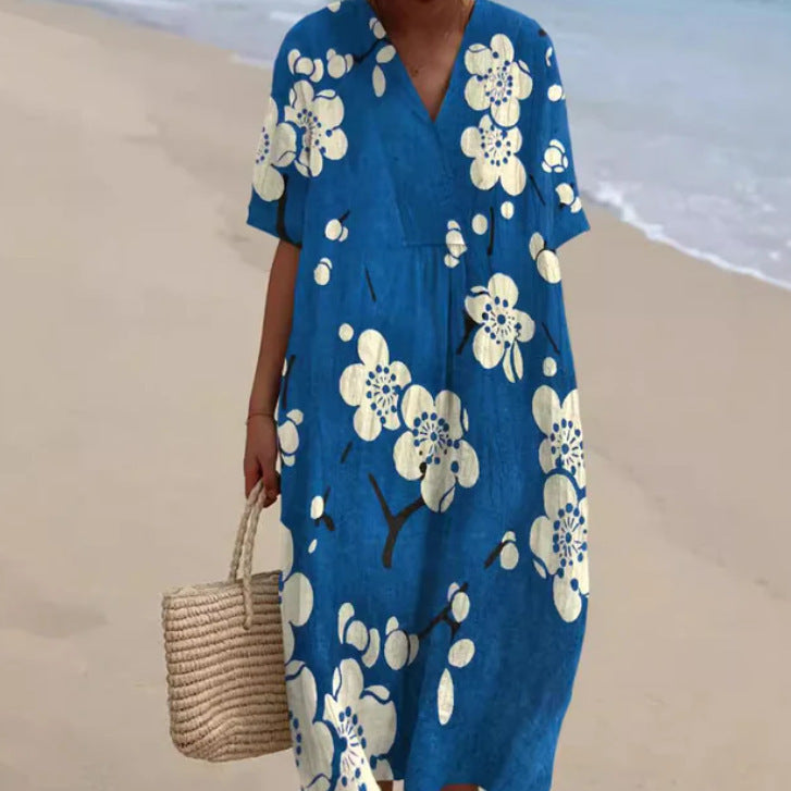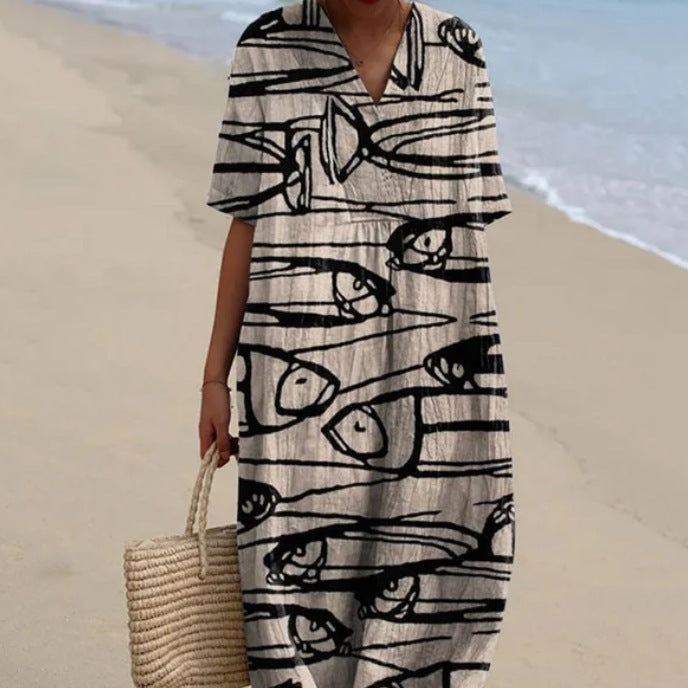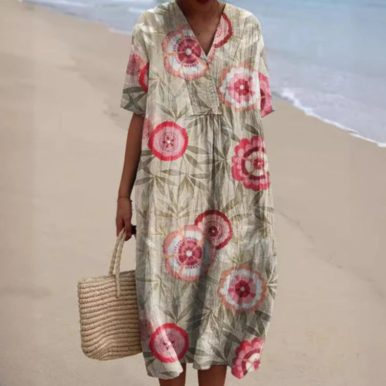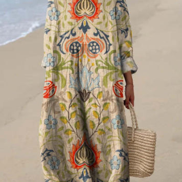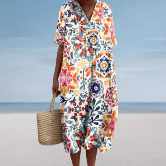 Long dress featuring a 3D floral print and a relaxed silhouette. Designed with half sleeves and an ankle-length skirt, this dress offers a flowing appearance suitable for various occasions. Available in multiple colors and an extended size range, it provides a versatile option for everyday wear.