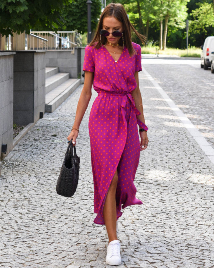 This women’s summer dress features a sleeveless A-line silhouette and all-over printed pattern, available in multiple colors including blue, red, pink, and polka dot. Designed for warm-weather wear, the lightweight construction and flared skirt allow for ease of movement. The dress falls at a balanced length, making it suitable for beach days or relaxed outdoor activities.