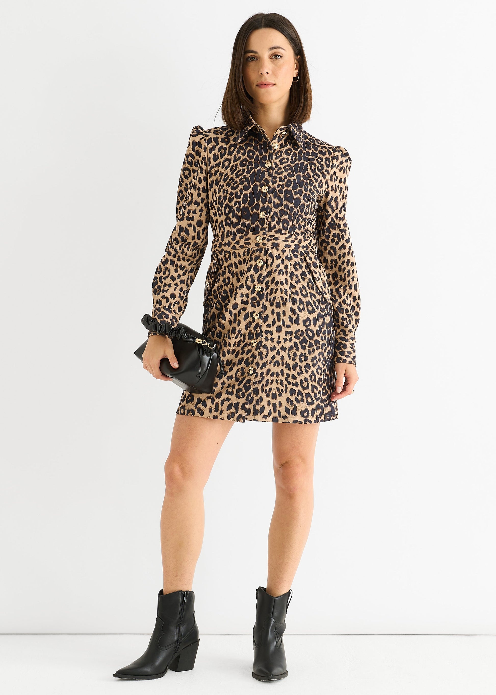 This women’s mini dress features a brown animal print with a military-inspired structured design. The fitted bodice and short length offer a defined silhouette, while the pattern adds visual interest. Its versatile style makes it suitable for daytime outings, social events, or seasonal layering.