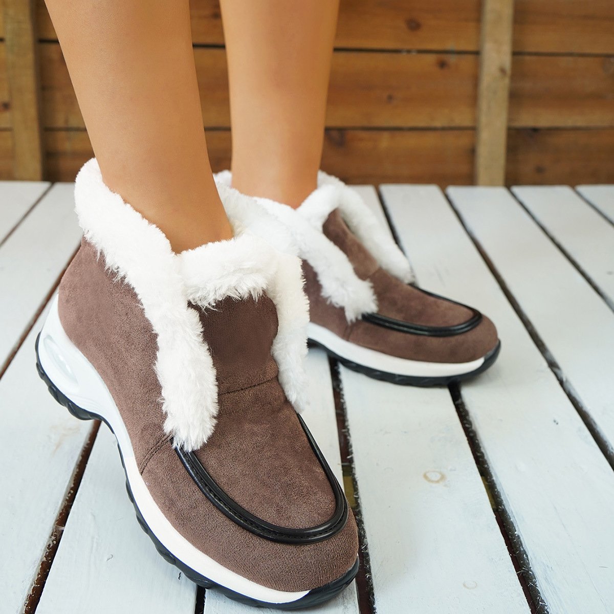 These women’s winter ankle boots feature a wedge heel design with an air-cushion sole for balanced elevation and stable wear. The low-cut upper and slip-on style make them easy to wear, while the round toe provides ample space for natural movement. A soft interior lining enhances insulation, and the solid color design pairs well with various cold-weather outfits.