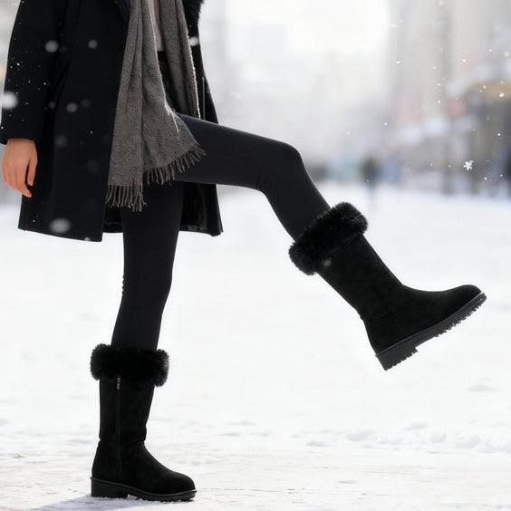 These mid-calf winter boots are designed for daily wear in cold conditions, offering practical coverage and stable support. The side zipper construction allows quick on and off, while the mid-length shaft provides added protection for the lower leg. A wedge sole supports steady walking on various surfaces, and the solid color finish allows easy coordination with seasonal outfits such as jeans, leggings, or skirts. The inner lining and structured shape make these boots suitable for extended outdoor use during winter months without restricting movement.
