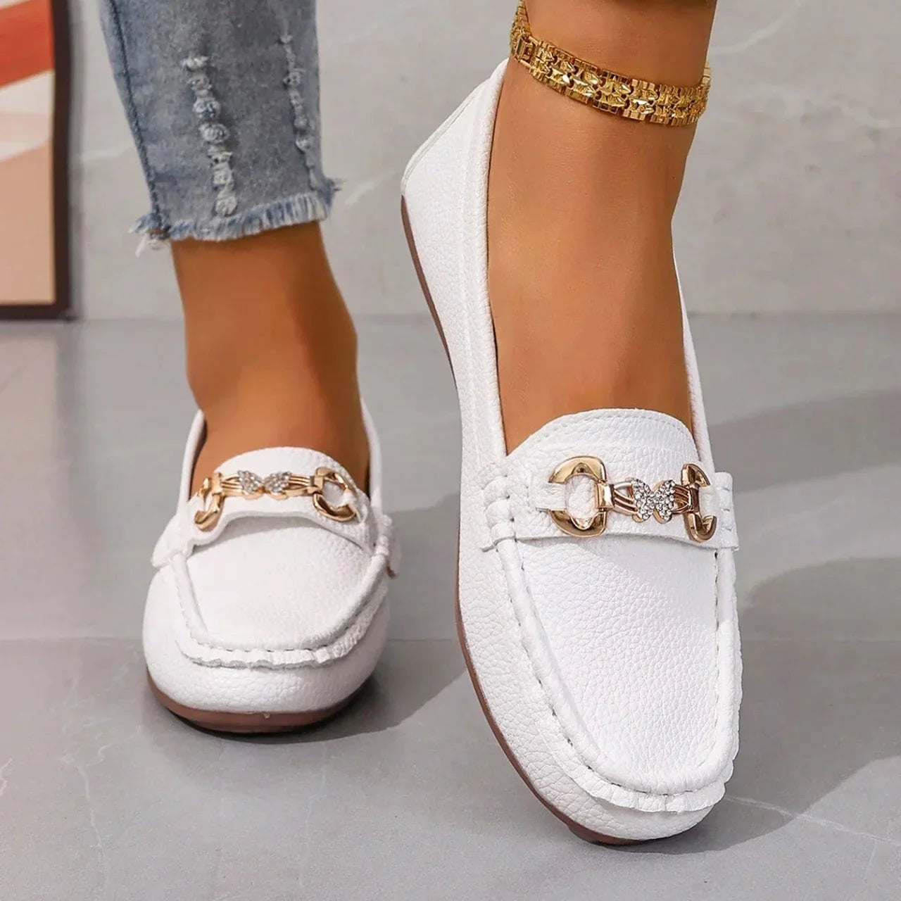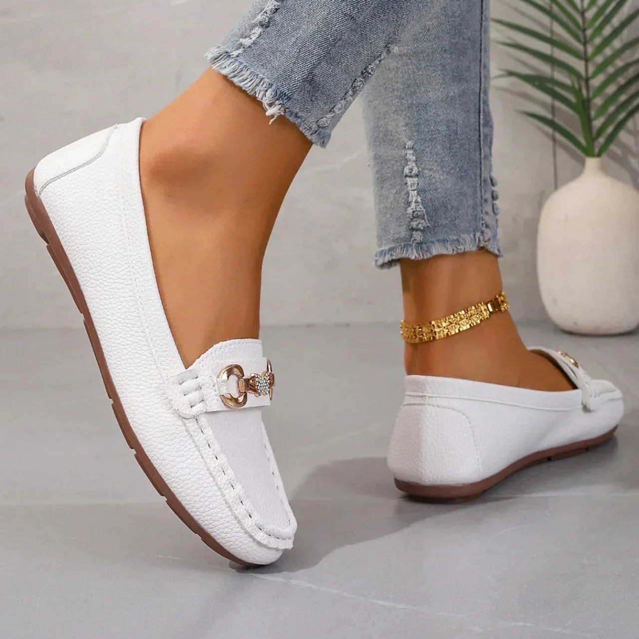 These women’s summer loafers feature a slip-on design with a smooth upper and orthopedic cushioning for all-day wear. The flexible construction adapts to natural foot movement, while the subtle butterfly accent adds refined detail. Ideal for daily wear or light walking.