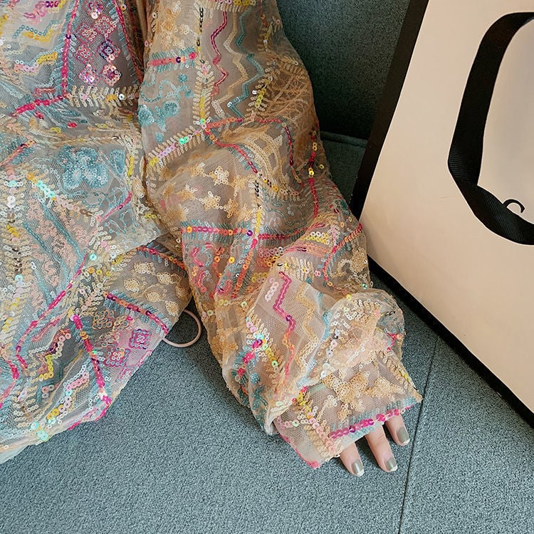 This lightweight coat features a loose fit designed for summer wear, combining colorful striped patterns with sequin detailing for a distinctive appearance. The batwing sleeves and hood offer added coverage and a relaxed silhouette, while the ordinary length and long sleeves make it suitable for breezy evenings. The combination of sequins and vibrant stripes enhances the overall design, creating a versatile outer layer for warm weather occasions.