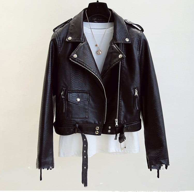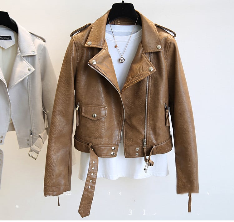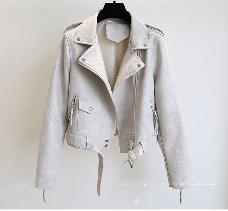 This women’s biker jacket features a sleek snake print pattern combined with a slim-fit silhouette for a defined shape. It includes a lapel collar and a front zipper closure, adding a structured and modern look. Designed with long sleeves and a standard length, it is available in black, brown, and white to suit different styling preferences.