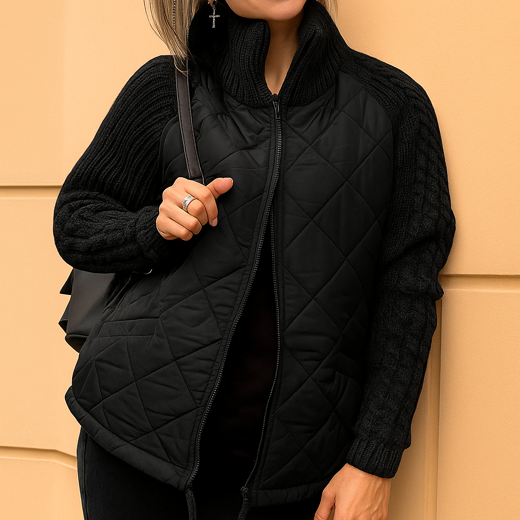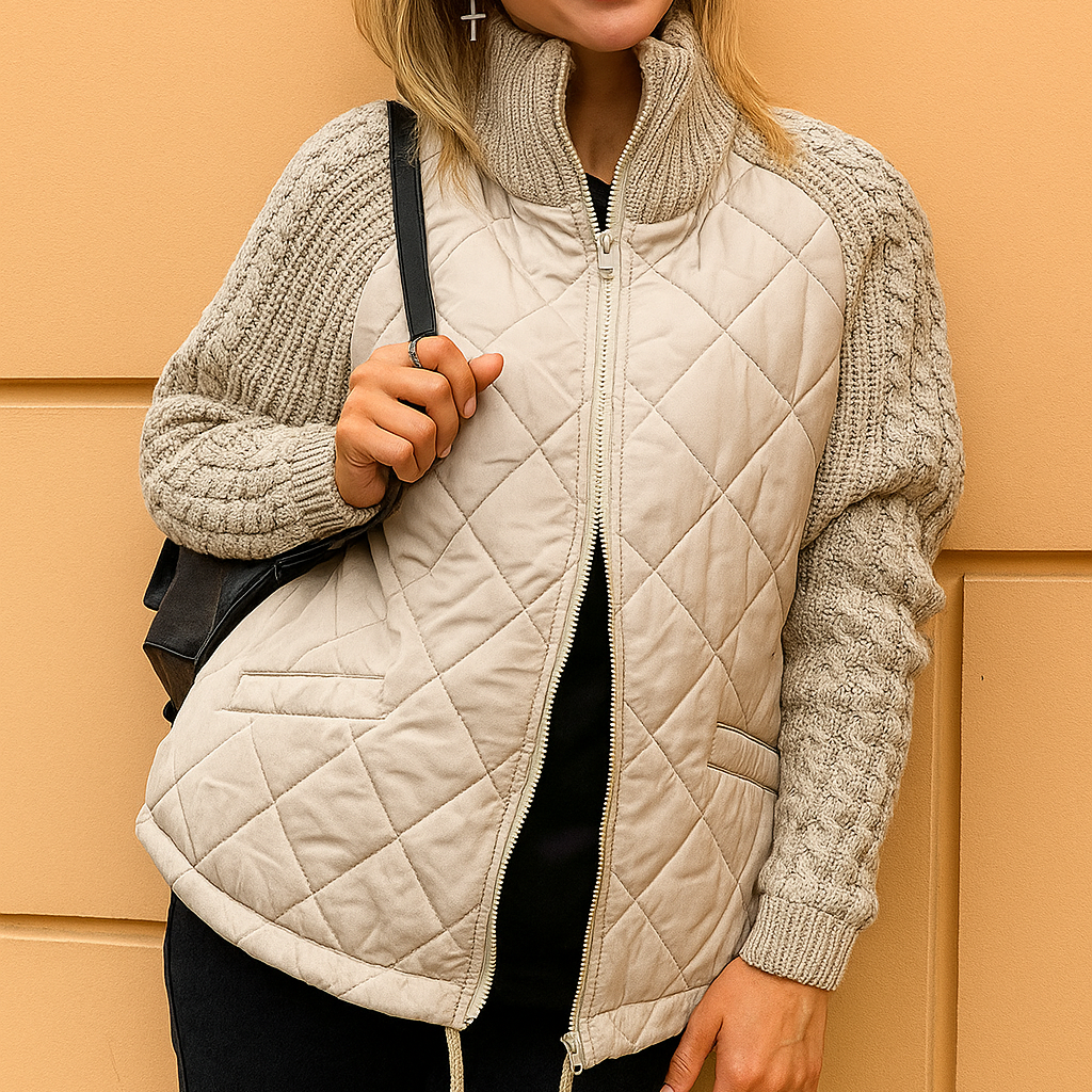 This winter jacket features a quilted body with knit sleeves and a high collar for added coverage. The jacket is lightly tailored to create a structured silhouette while allowing ease of movement. Designed for cooler weather, it provides warmth without bulk and can be paired with various bottoms for versatile seasonal wear.