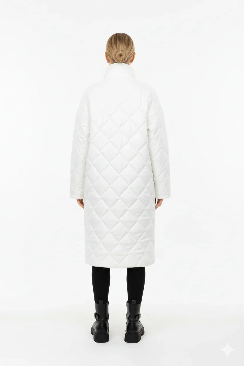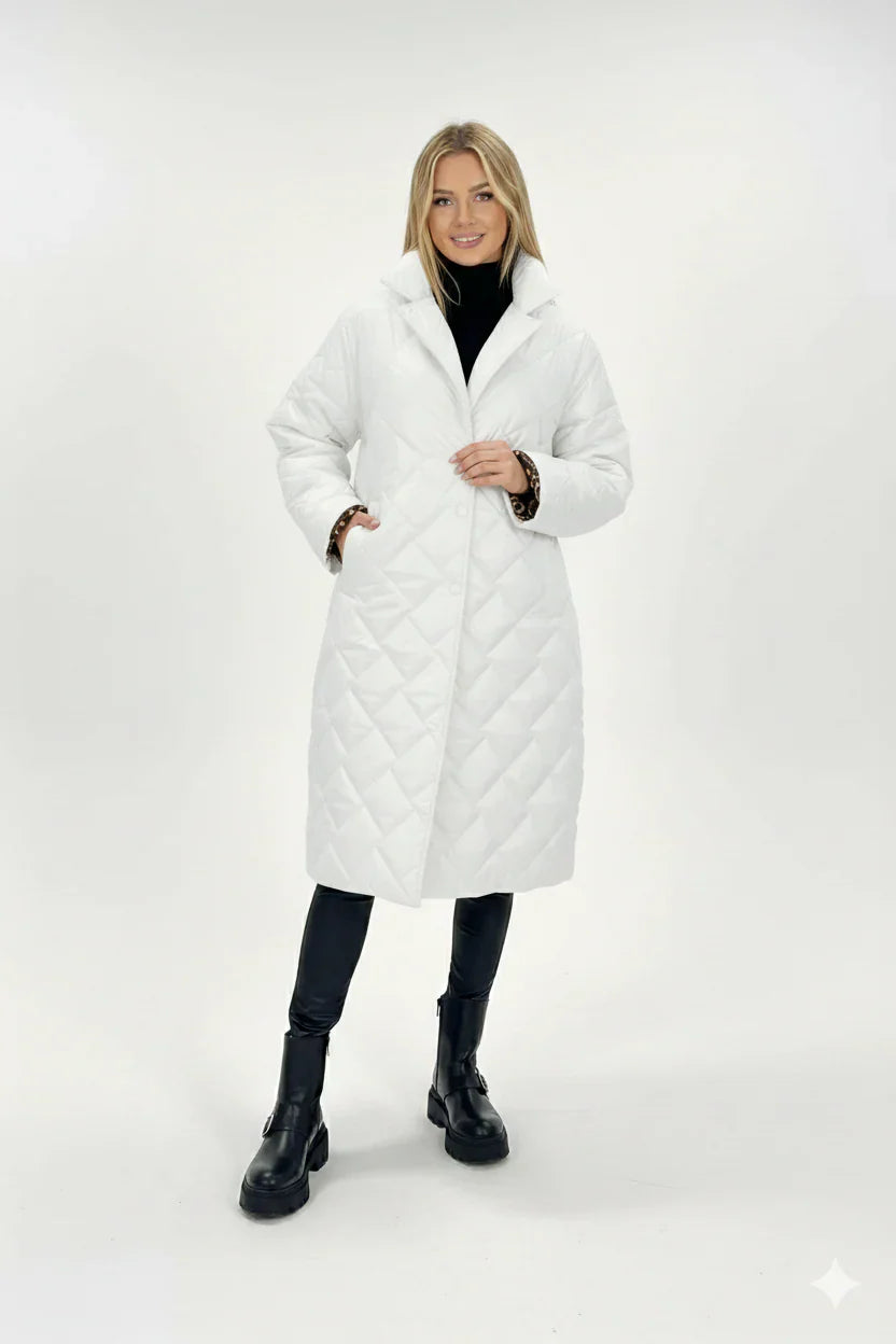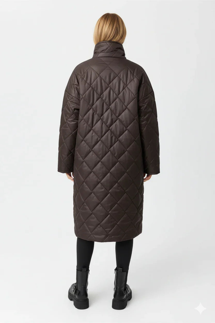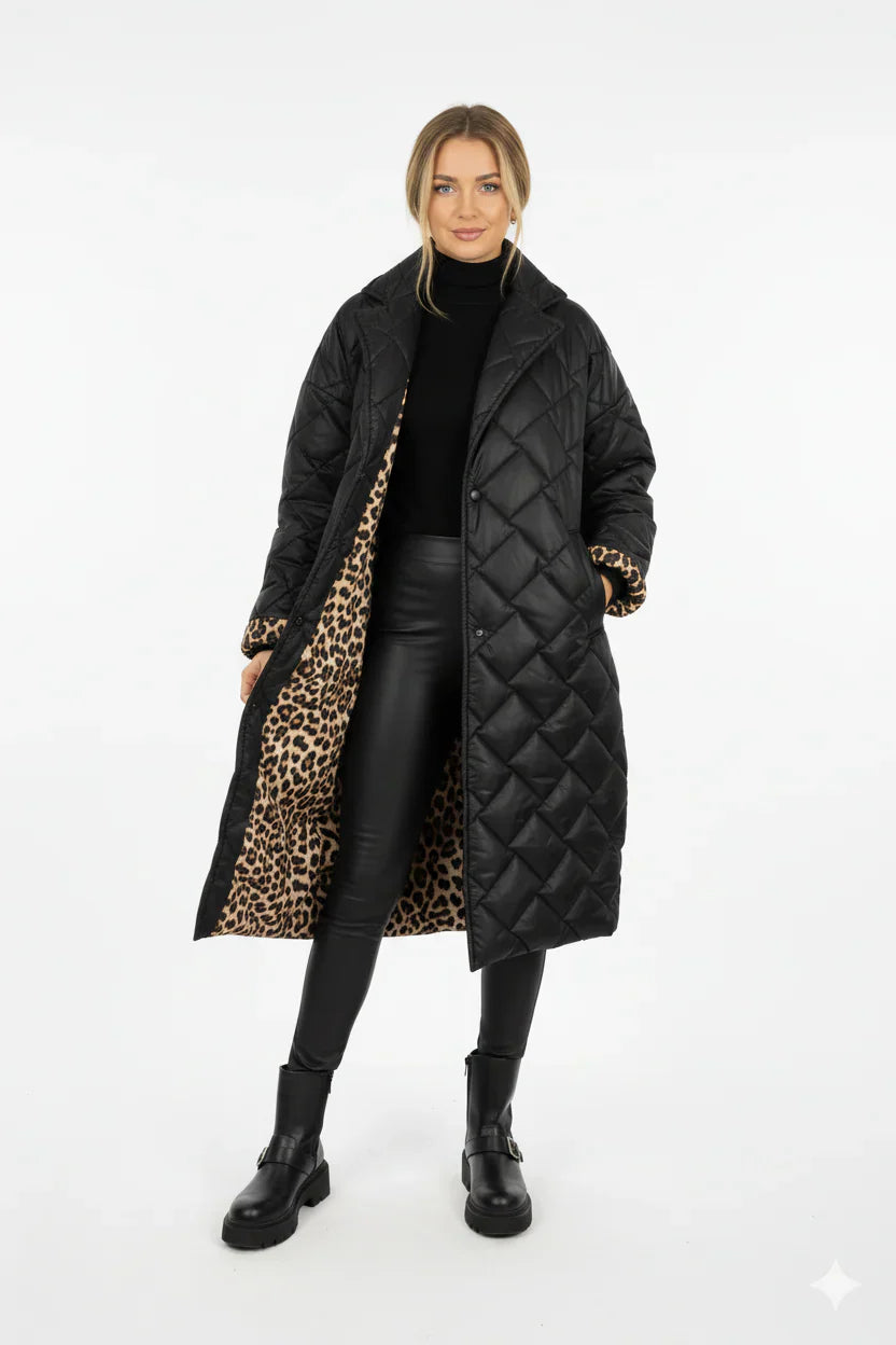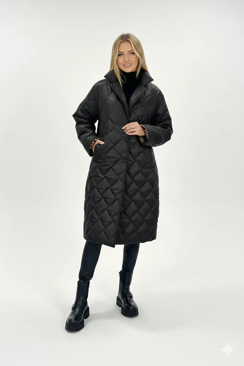 This reversible padded jacket offers two wearable styles in one piece, featuring a printed lining on one side and a plain exterior on the other. The extended coverage supports use during colder days, while the padded structure provides consistent insulation. Its hoodless design keeps the silhouette streamlined, and the straight cut allows layering without restricting movement. Suitable for daily wear in urban or outdoor settings, it maintains practical use throughout the winter season.