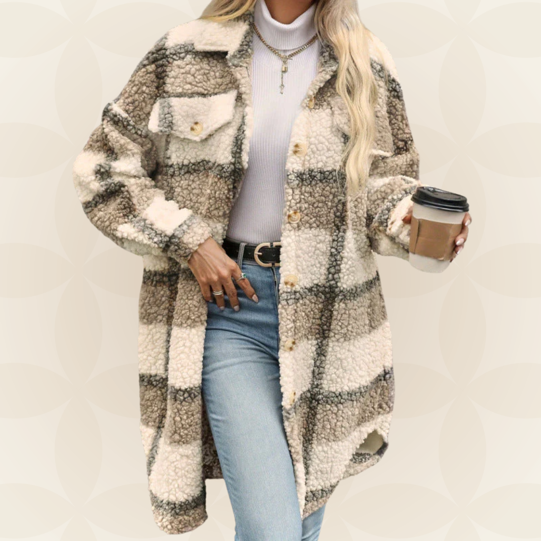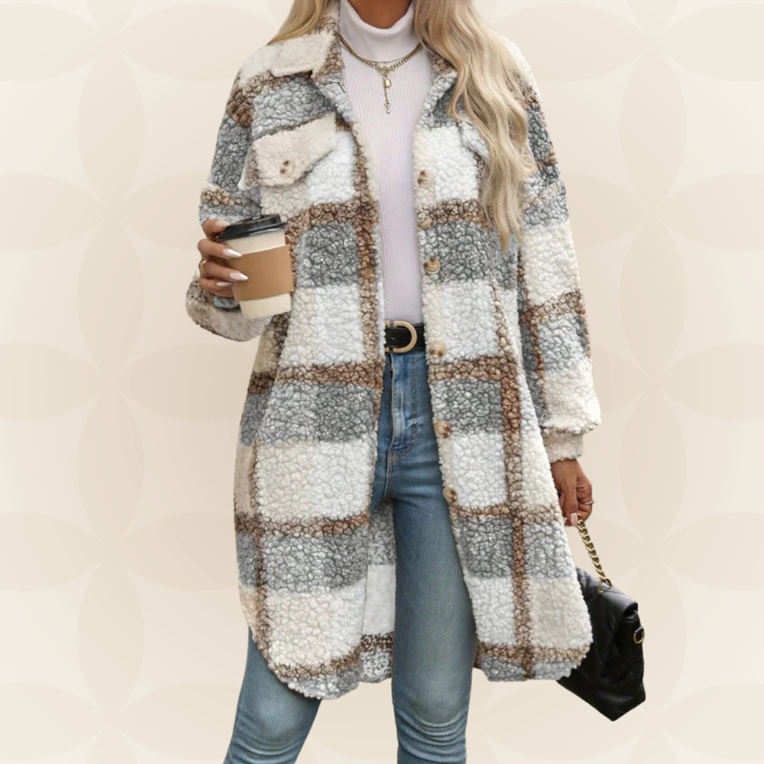 Women Autumn Long Coat Plaid Teddy Look Button Closure