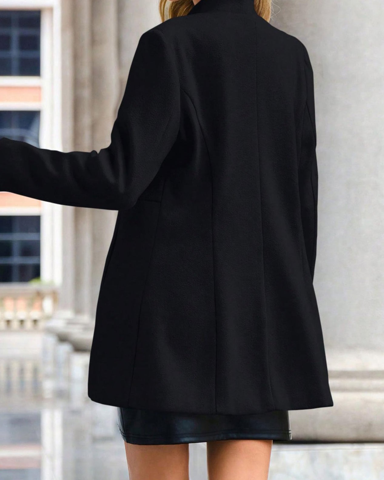 This slim-fit jacket features a structured stand collar and an open front design, offering a modern, tailored silhouette. The long sleeves and clean lines make it versatile for layering over tops or dresses. Functional pockets add practicality without disrupting the sleek look, making it suitable for work, outings, or semi-formal occasions.