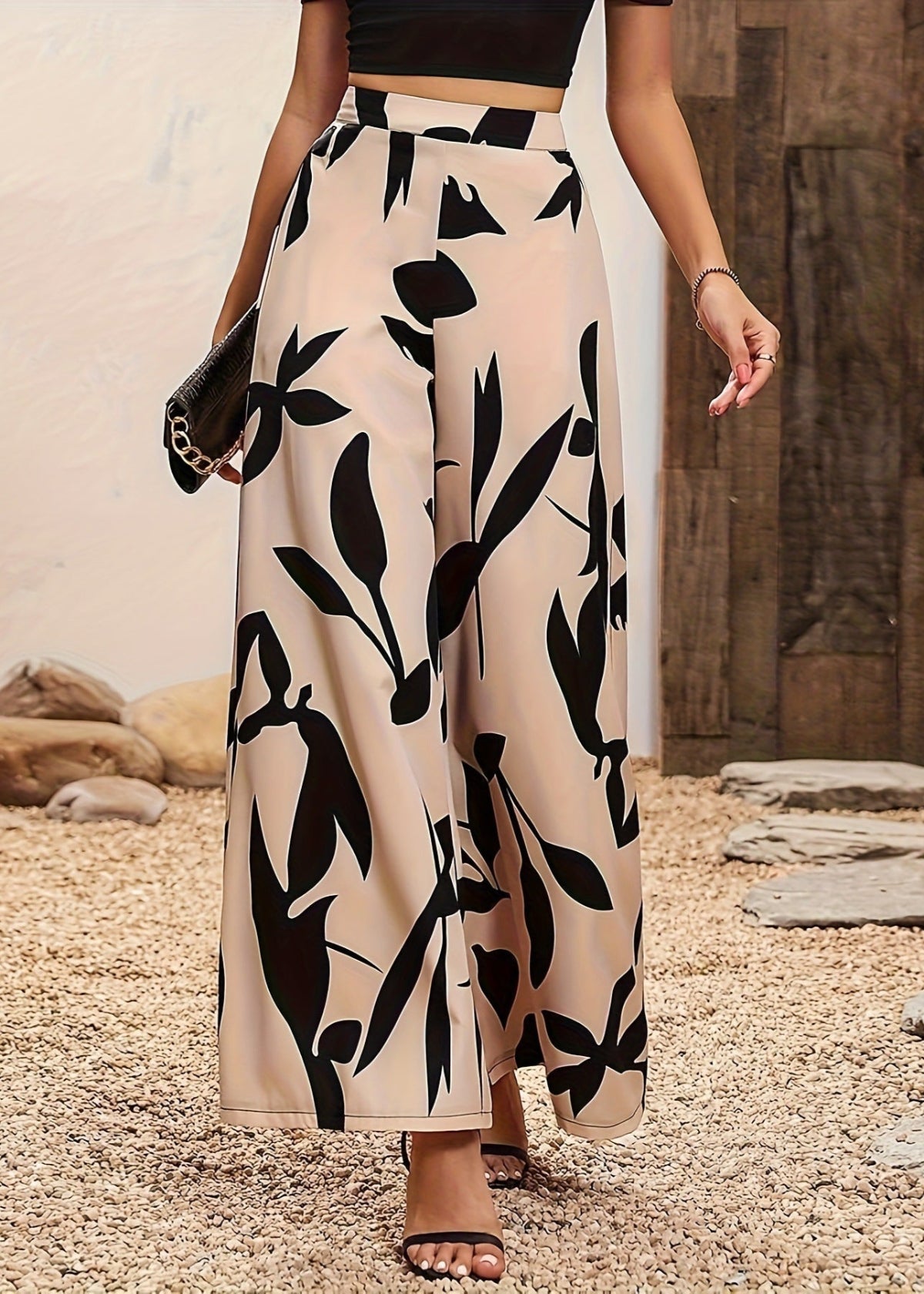 These wide-leg trousers feature an all-over leaf print and a high-waisted cut designed for warmer days. The relaxed fit supports airflow and movement, while the structured waistband and zipper closure offer a secure fit. The silhouette drapes loosely from the waist down, making the piece suitable for daily wear or informal gatherings.
