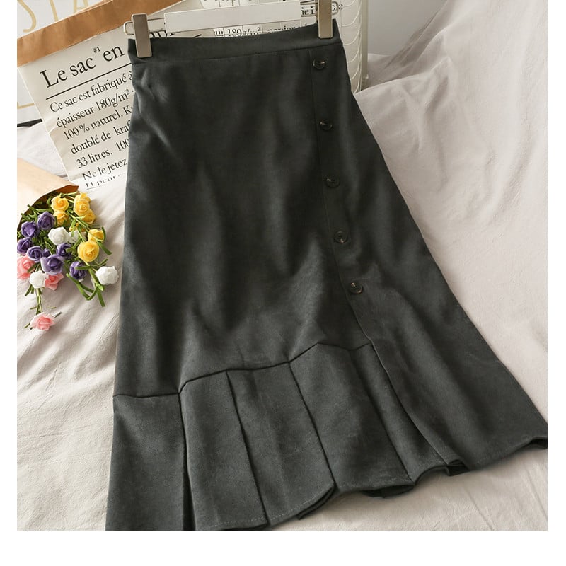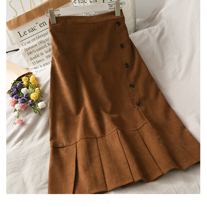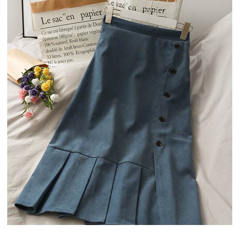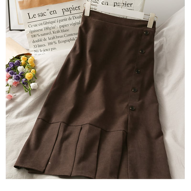 • Button-front closure: Adds structure and visual detail to the skirt