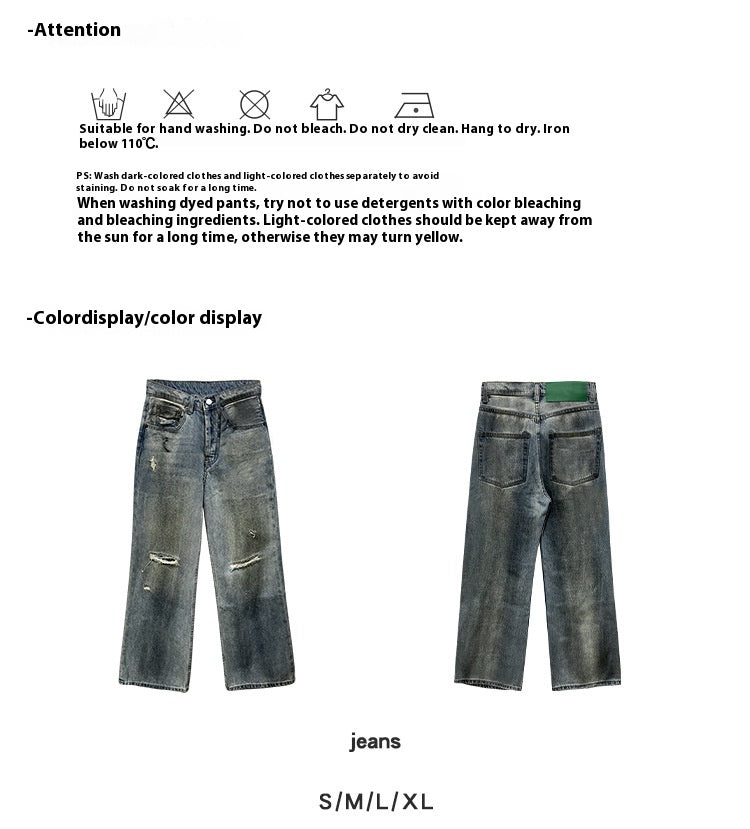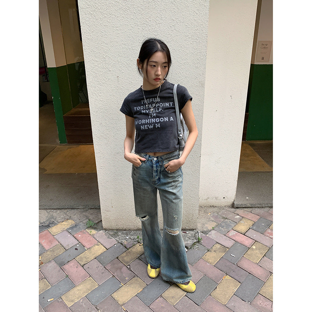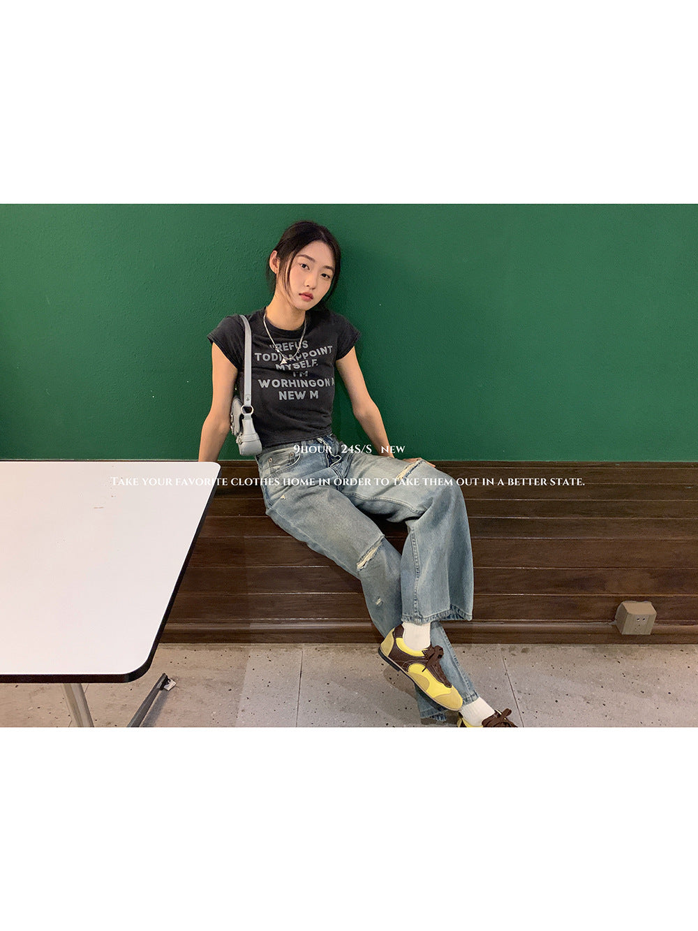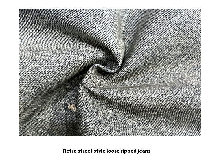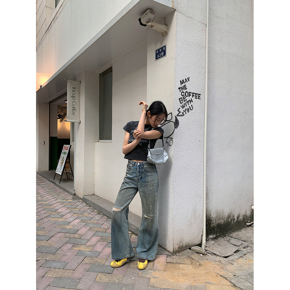 These straight leg denim jeans feature a retro-inspired ripped design that adds character to a classic fit. The high street aesthetic pairs well with a variety of tops and shoes, making them versatile for daily wear. The cut offers a slimming effect while maintaining a structured silhouette.