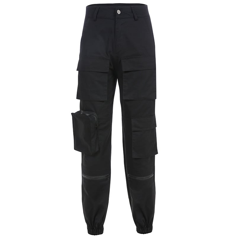 These women’s workwear pants feature a high-waist design and a relaxed straight-leg fit with ankle-banded cuffs for a structured, modern look. The multiple pocket detailing enhances practicality while adding a utility-inspired element. Ideal for streetwear and functional daily wear, these trousers balance a clean construction with contemporary design details.