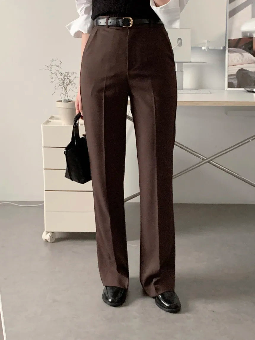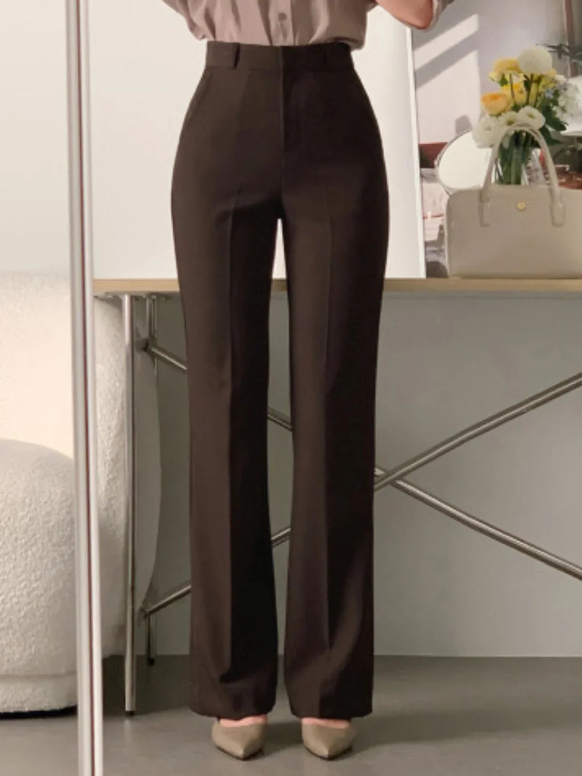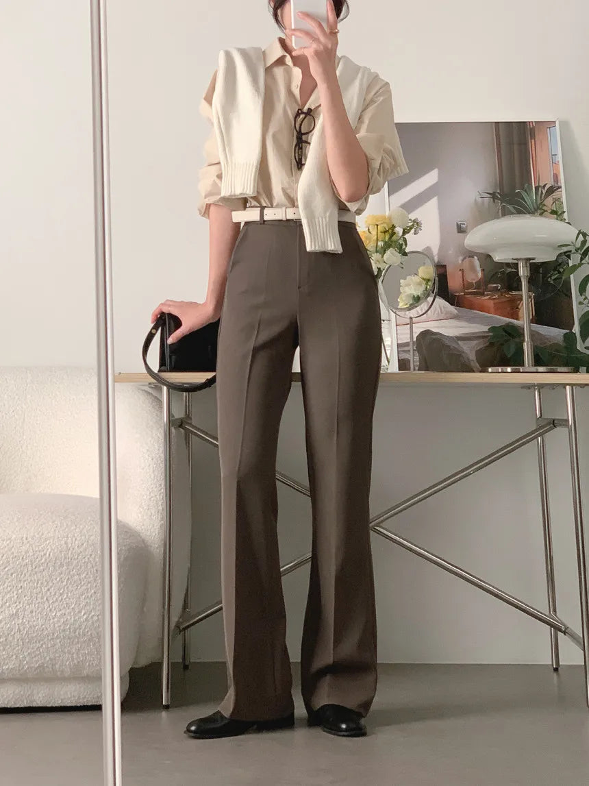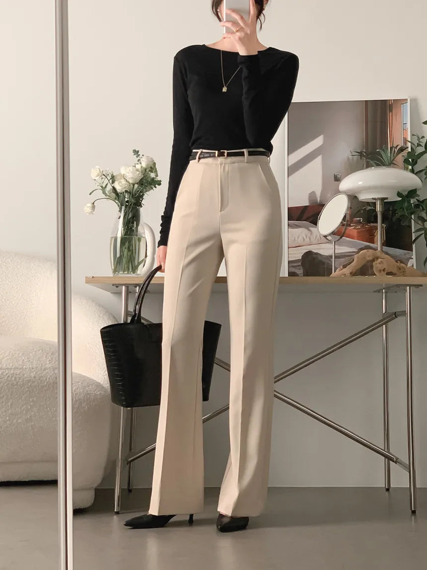 These women’s wide leg pants are designed with a high waist and a flowing leg shape that supports a clean, modern silhouette. The structured waistband provides a defined fit at the waist, while the wide leg cut allows natural drape through the length of the trousers. This design is suitable for daily wear, office settings, or relaxed occasions, offering flexibility in styling without added detailing. The overall construction focuses on proportion, movement, and simplicity, making the pants adaptable across different outfits and settings.