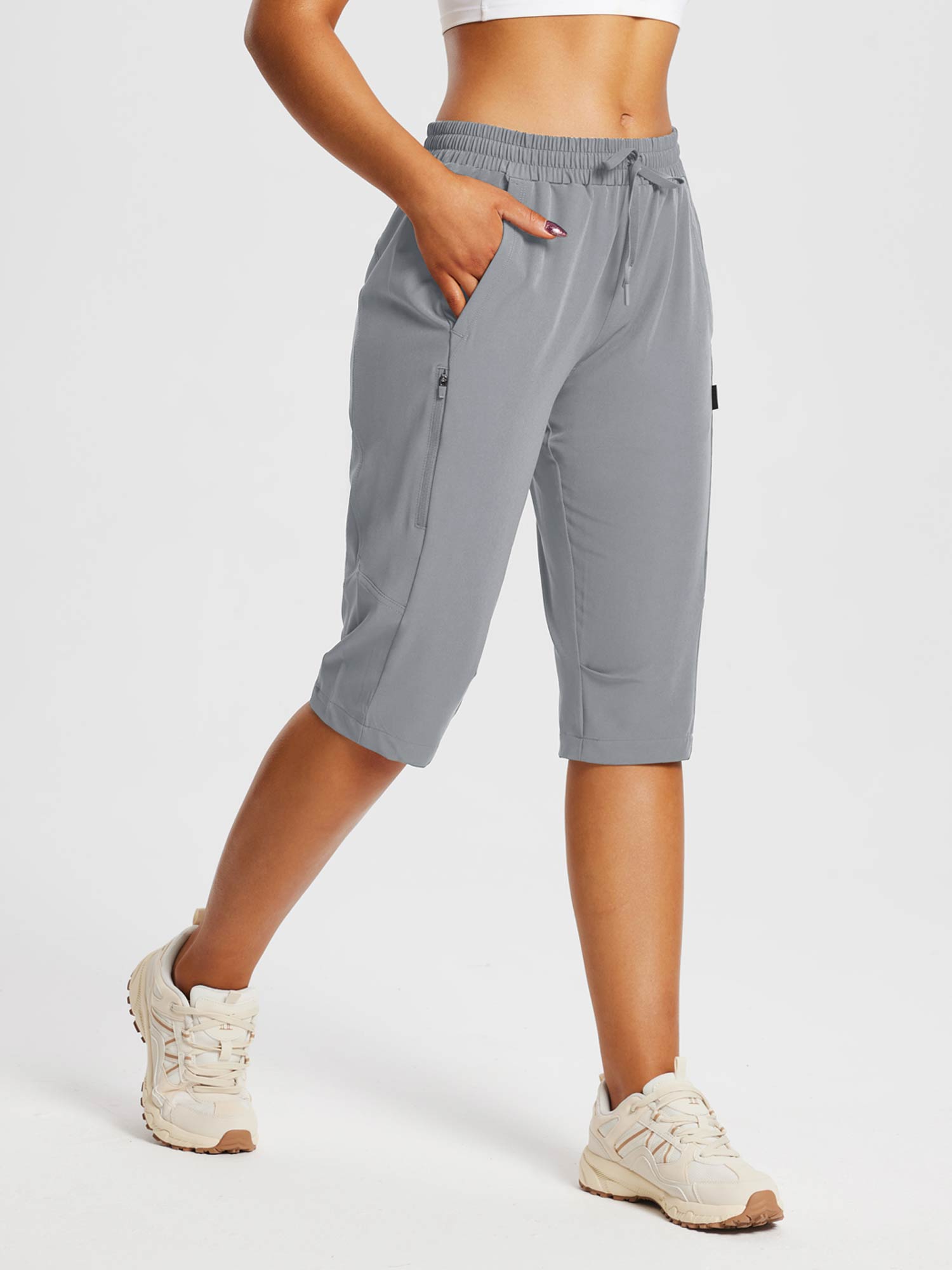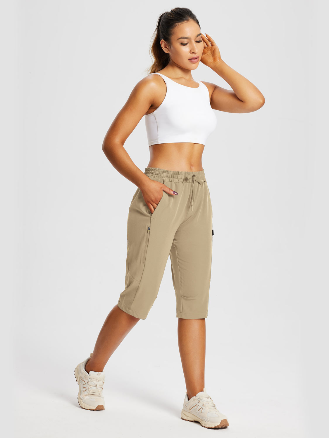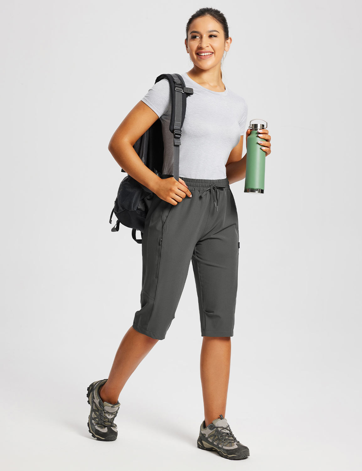 These capris feature a knee-length design with a slightly wide leg for unrestricted movement. The elastic waistband with drawstring provides a flexible fit, while the flatlock seams reduce chafing. Three pockets—including one zippered side pocket—offer practical storage. Lightweight and breathable, these capris provide UPF 50+ sun protection and four-way stretch, making them suitable for hiking, trekking, travel, or outdoor activities.