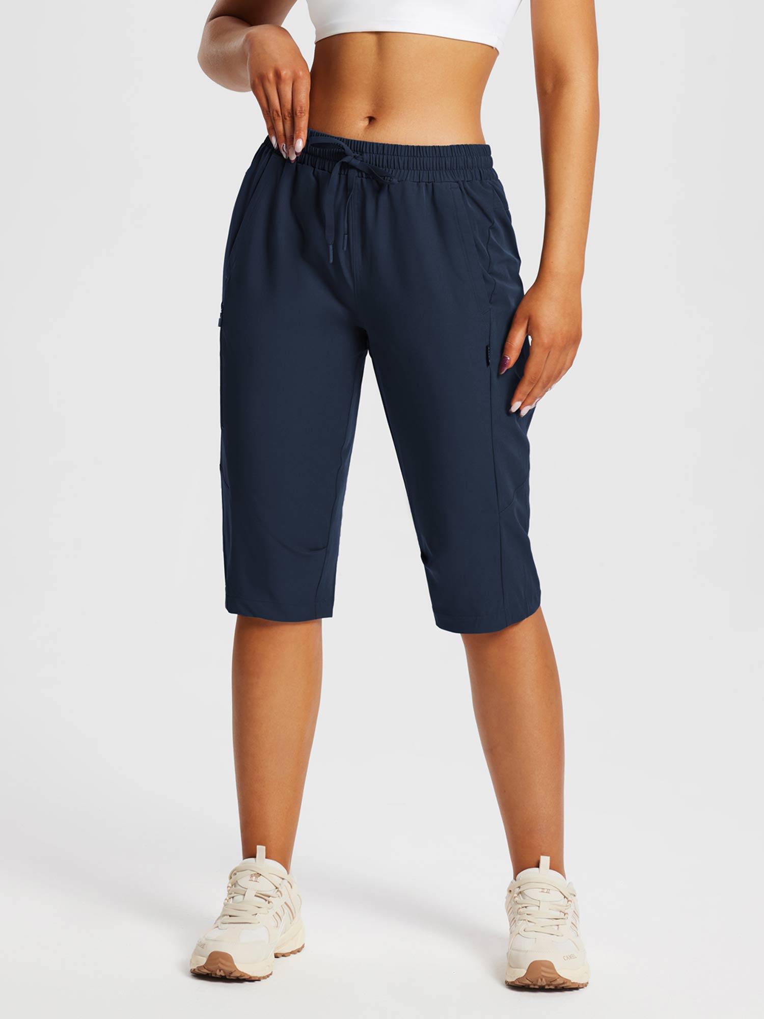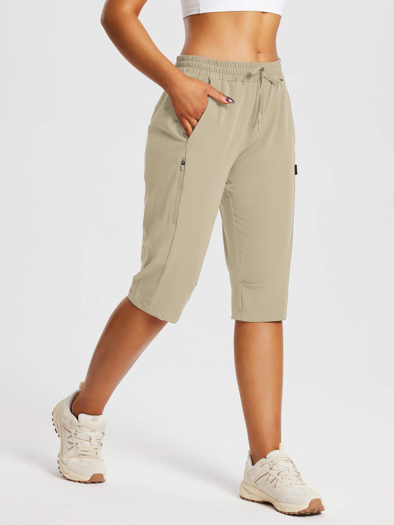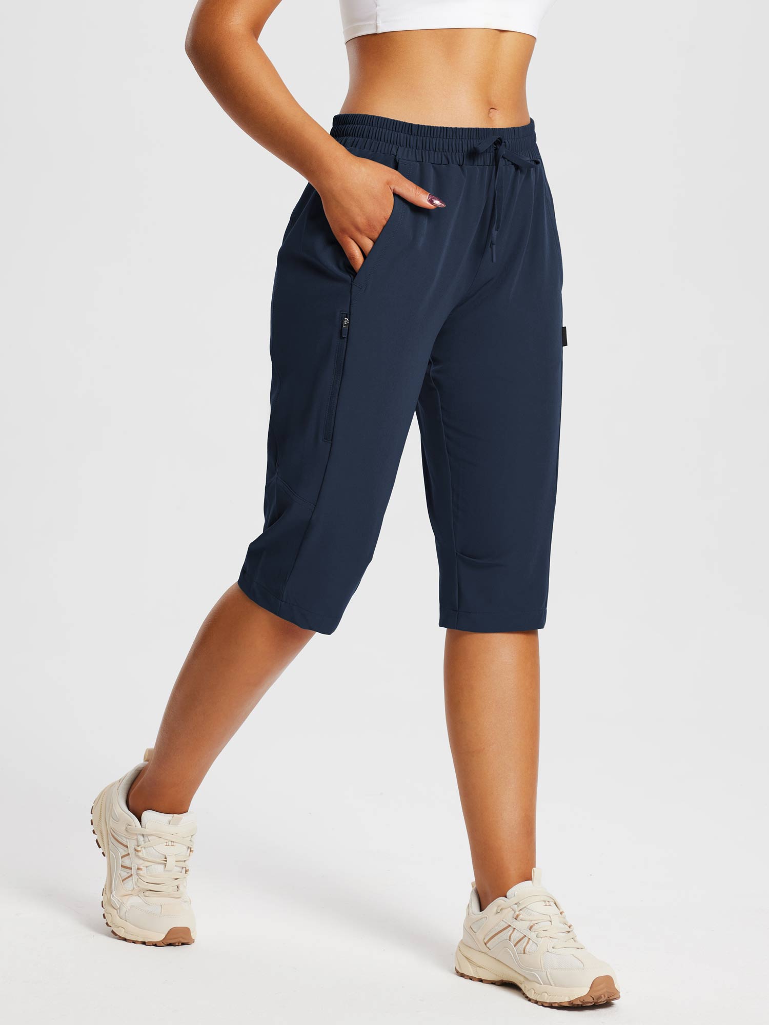 These capris feature a knee-length design with a slightly wide leg for unrestricted movement. The elastic waistband with drawstring provides a flexible fit, while the flatlock seams reduce chafing. Three pockets—including one zippered side pocket—offer practical storage. Lightweight and breathable, these capris provide UPF 50+ sun protection and four-way stretch, making them suitable for hiking, trekking, travel, or outdoor activities.