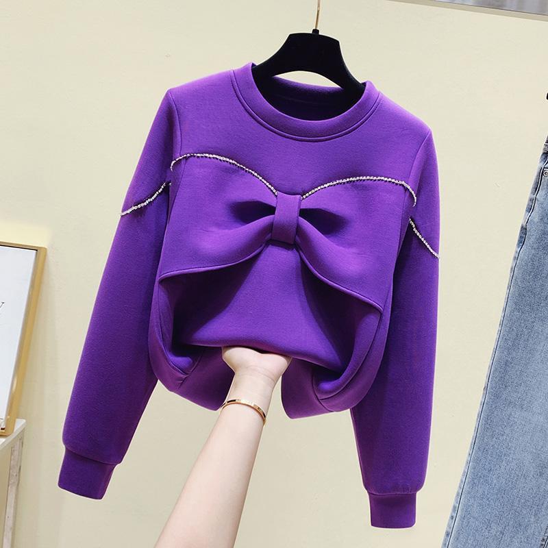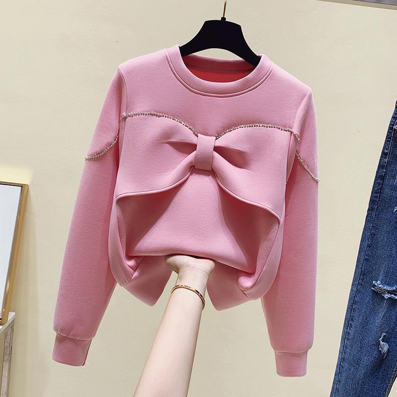 This women's spring sweater features a round neckline with diamond embellishments and a decorative bow for added detail. Designed with flight sleeves, it offers a relaxed fit and a pullover style suitable for layering. The lightweight construction supports breathability during warmer transitional months.
