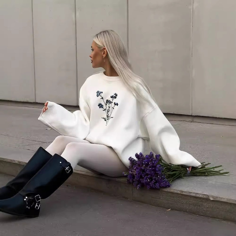 Women Autumn Crew Neck Sweater Floral Embroidery Regular Fit Long Sleeves White