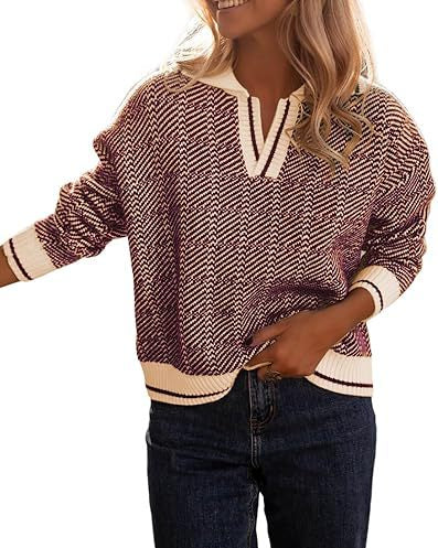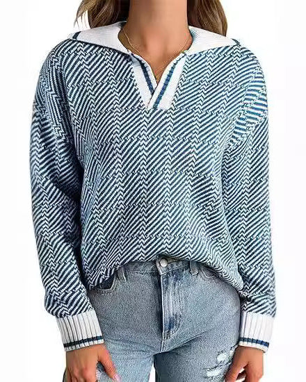 Women’s Pullover Knit Top with Lapel Collar and Long Sleeves
