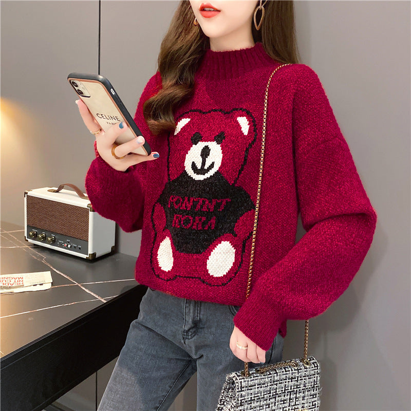 Title: Women Autumn Sweater with Bear Pattern and Loose Knitted Design