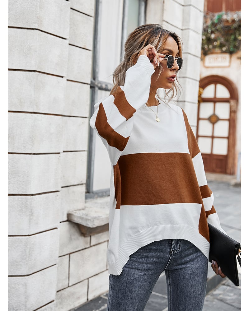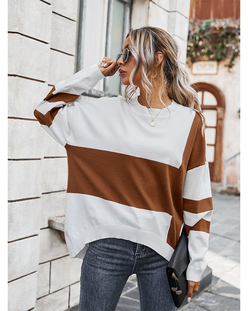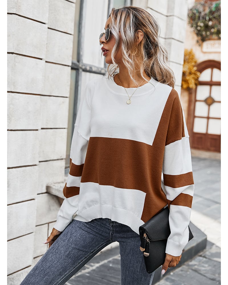 This women’s pullover sweater features a color block stitching design with a classic round neckline and long sleeves. Its loose silhouette provides a relaxed fit, making it suitable for layering or wearing on its own. The contrast stitching adds visual depth and a modern touch, ideal for versatile daily wear.