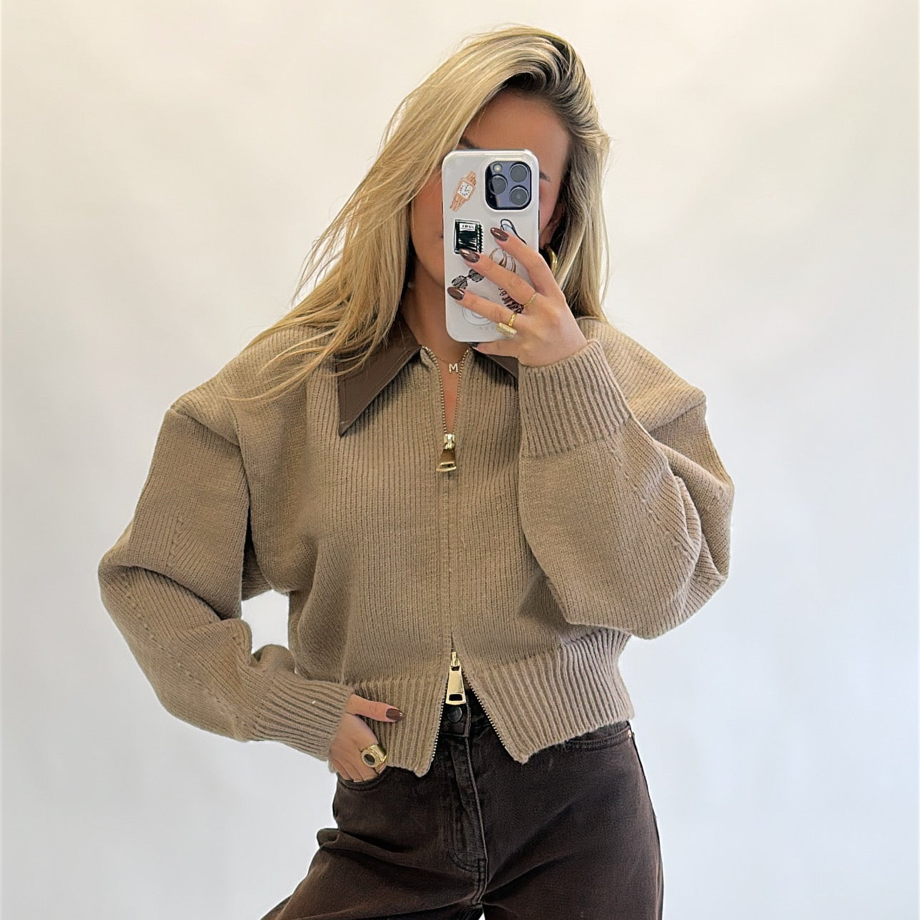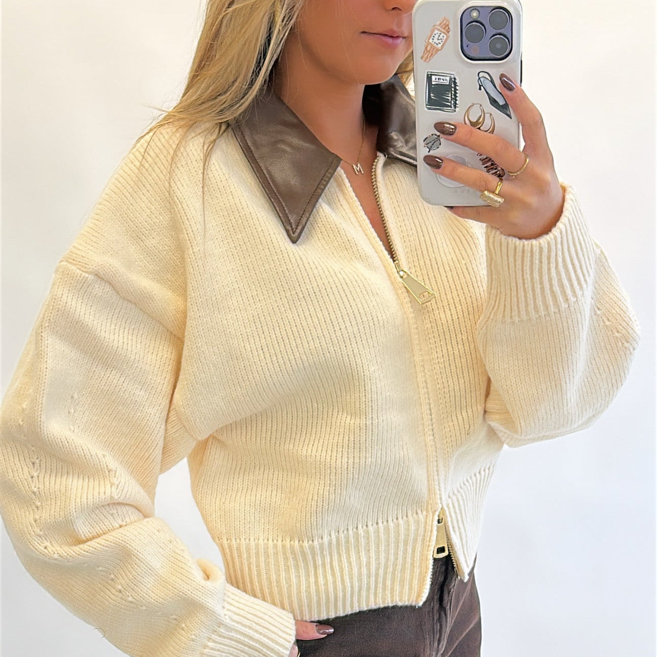 This knit zip sweater features a leather collar and two gold zippers for versatile styling, allowing it to be worn open for a relaxed look or zipped up for a polished finish. The soft, lightweight knit provides a smooth texture, while the slightly oversized fit adds ease of movement. Available in cream and taupe, it combines subtle detailing with functional design for everyday wear.