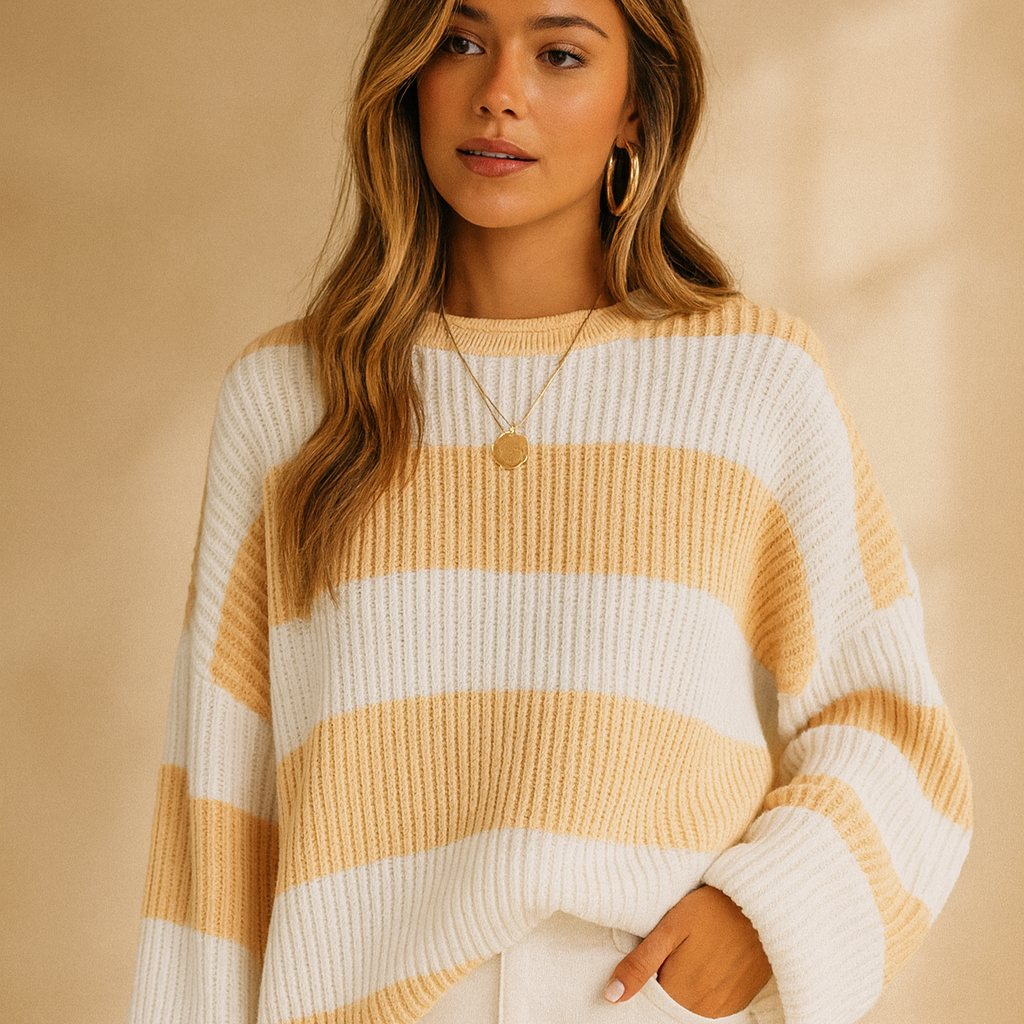 This striped knit sweater features a relaxed fit with dropped shoulders and a round neckline, offering a clean and versatile layering option. The colorful stripe pattern adds visual interest, while the soft, breathable knit fabric ensures ease of movement. Designed for spring and autumn, it can be paired with jeans, skirts, or layered over other tops.