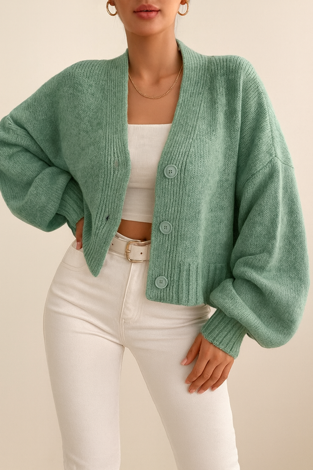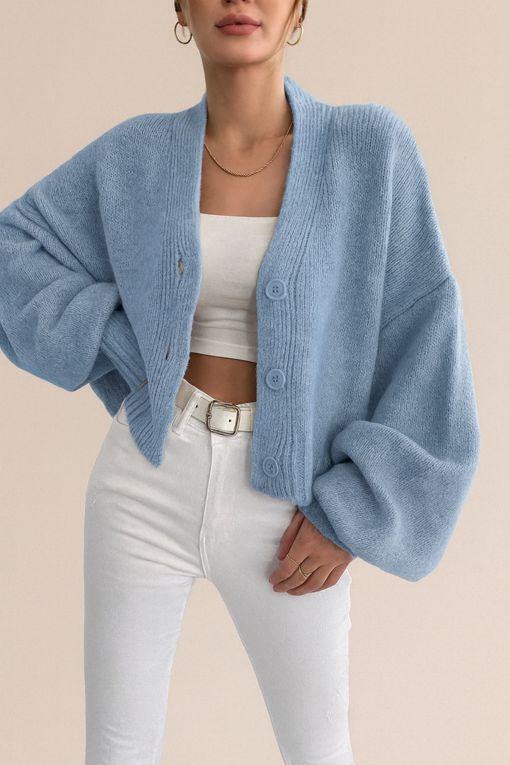 Women Autumn Knit Cardigan Short Length Puff Sleeves V-Neck