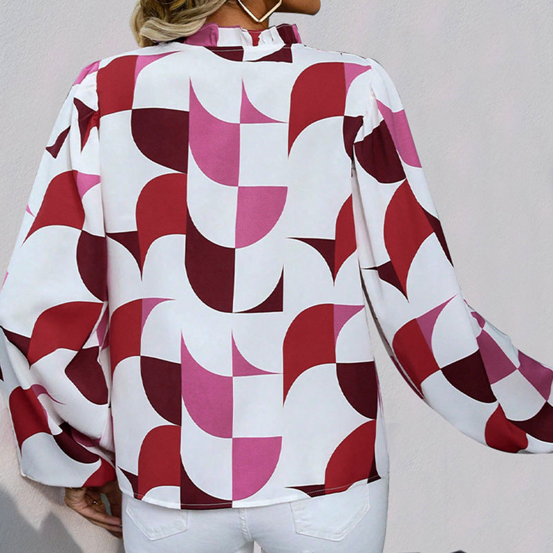 Women Fall Pullover Shirt with Stand Collar Bubble Sleeves and Geometric Print