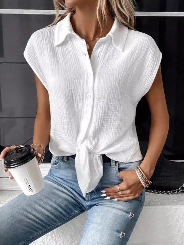 Women Summer Short Sleeve Blouse with Button Front and Embroidery Detail