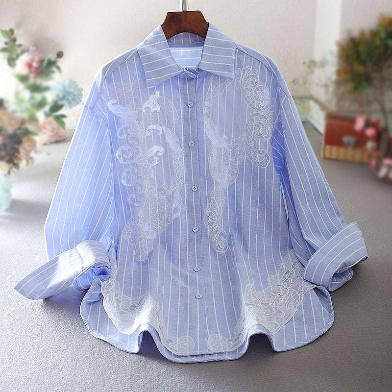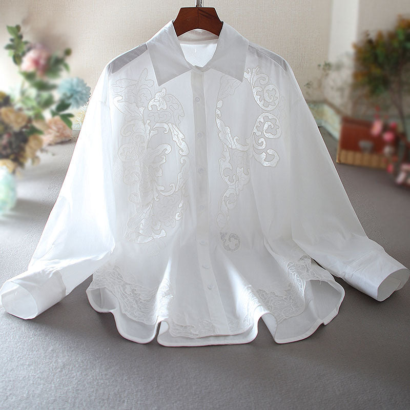 Women Top Long Sleeve Oversized Hollow Mesh Embroidered