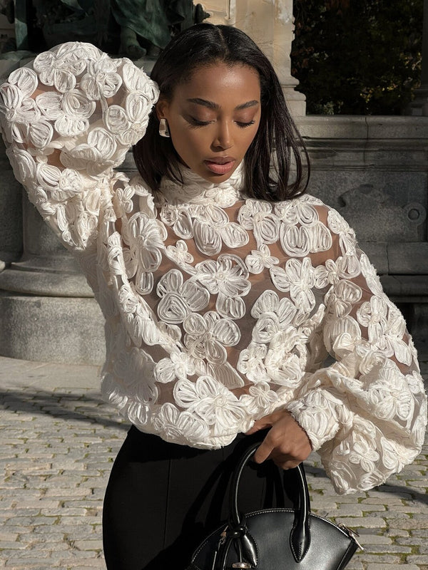 Women Spring Shirt Floral Texture Pearl Button Loose Fit Regular Length