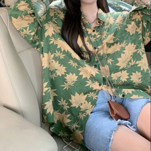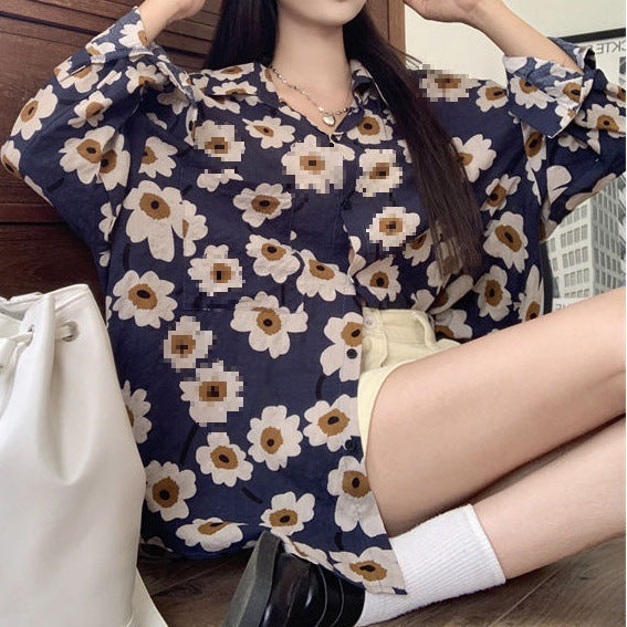 This Long Sleeve Button-Up Shirt features a loose fit with printed patterns including floral and leaf motifs. Designed with a button-up front and regular sleeves, it is suitable for layering or standalone wear across various occasions. Available in multiple colors such as Sunflower, Vintage Blue, Yellow Flower, Green Leaf, and Black, it pairs well with jeans, trousers, or skirts.