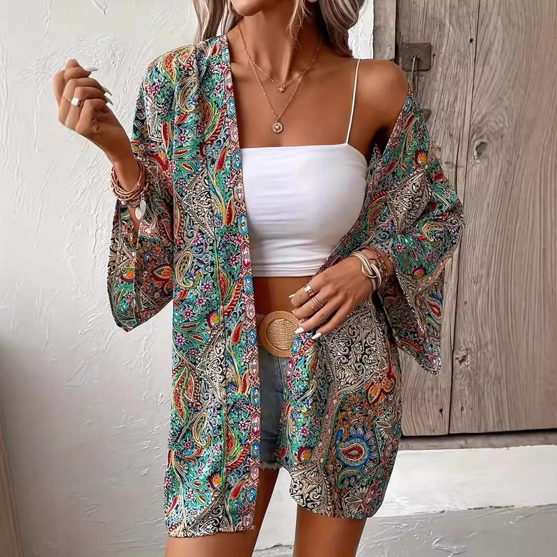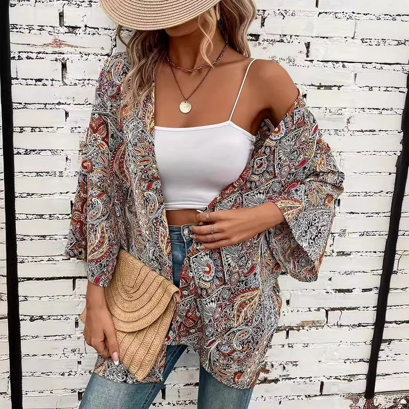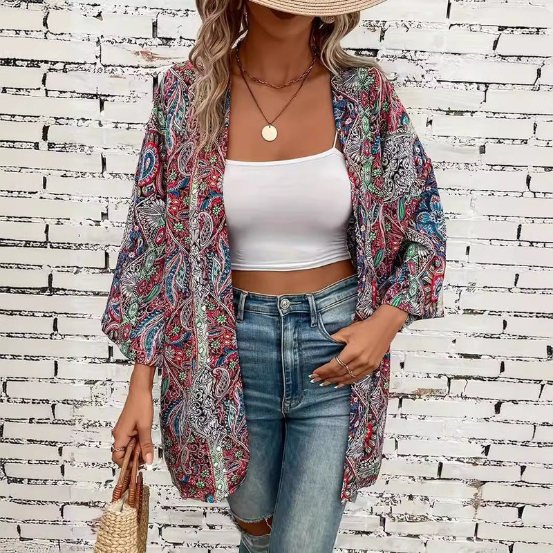 This Long Sleeve Shirt features a loose fit with a round neckline and a buttoned front. Designed with an ethnic floral print, it offers a bohemian-inspired style suitable for various occasions. The lightweight fabric allows for layering or standalone wear and pairs well with jeans, skirts, or trousers.