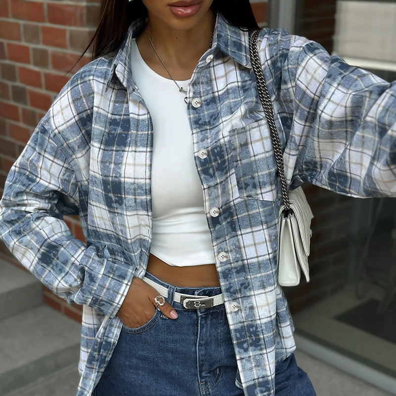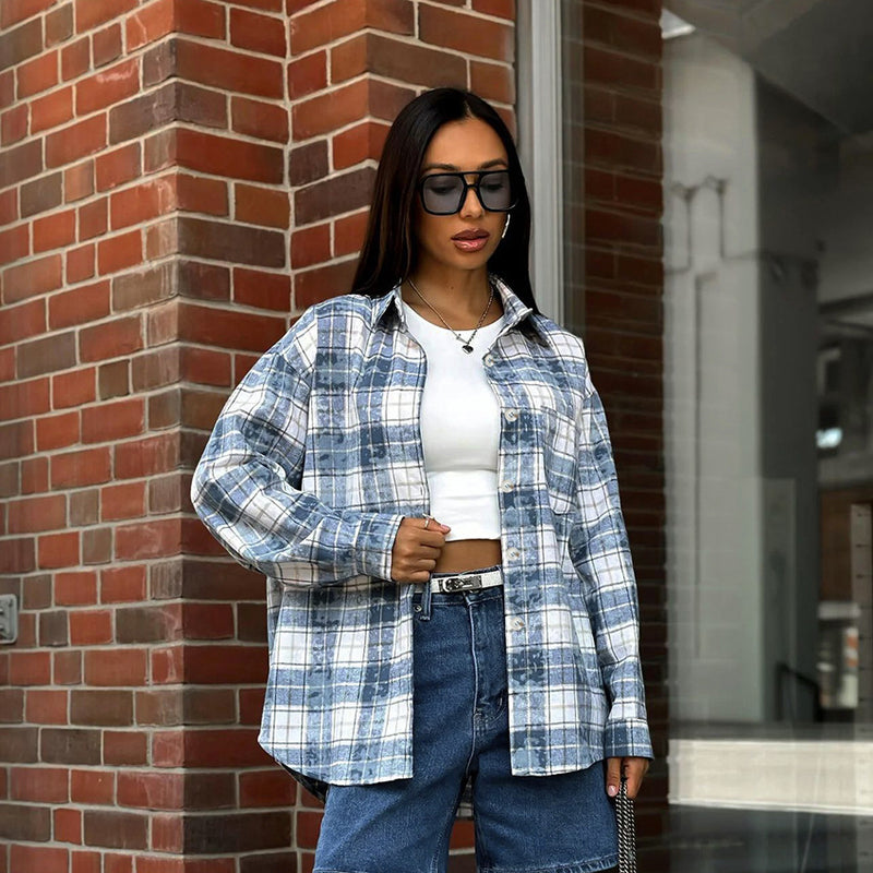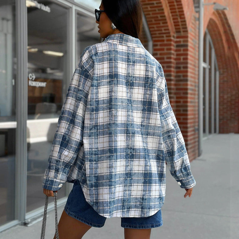 Women Fall Plaid Shirt Loose Fit Medium Length with Chest Pocket and Button Front