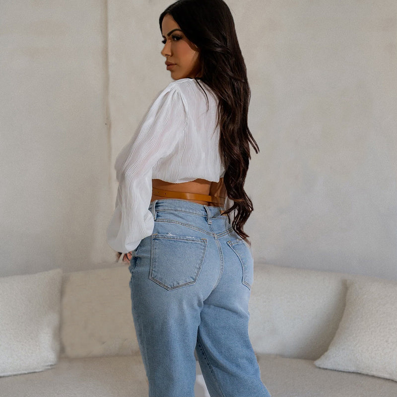 Women Spring Shirt With Adjustable Belt And Lantern Sleeves