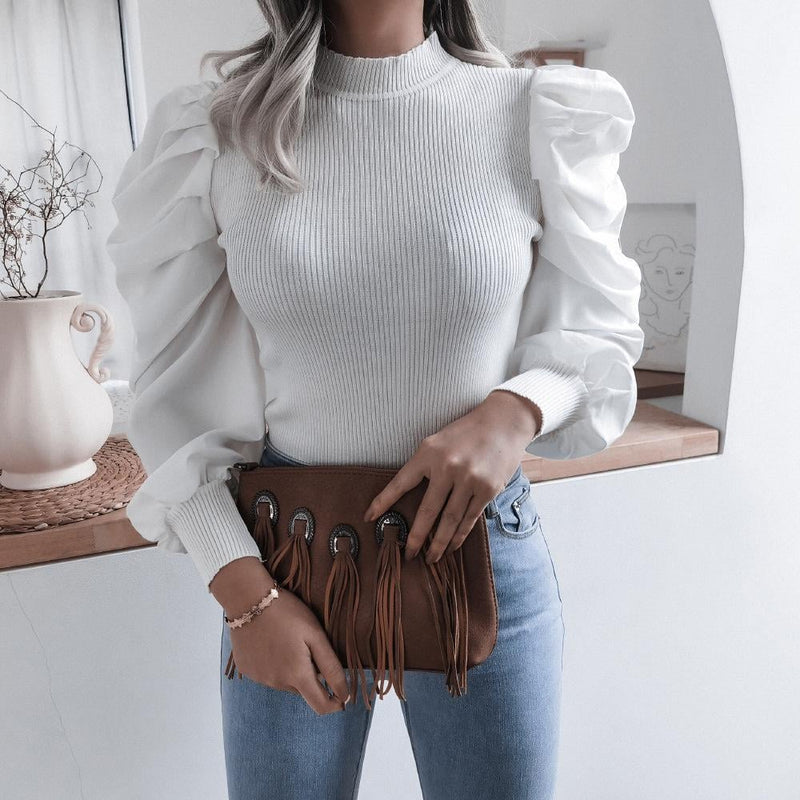 Women Spring Knit Top with Long Puff Sleeves Pullover