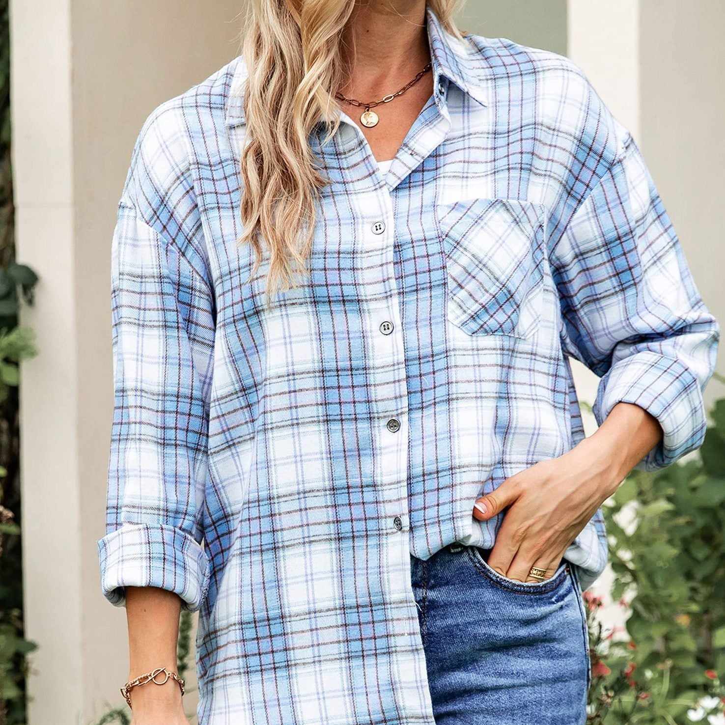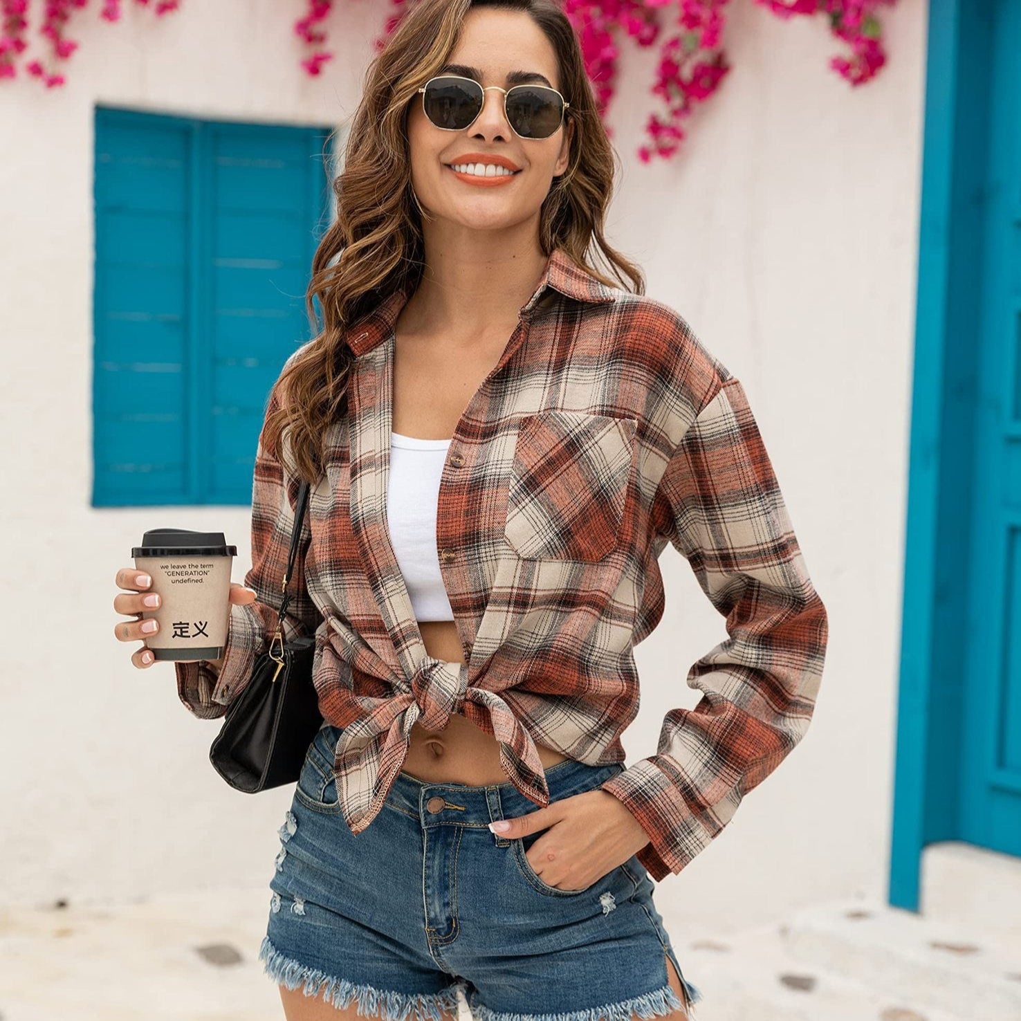 Title: Women Long Sleeve Mid-Length Plaid Shirt with Front Pocket and Button Closure