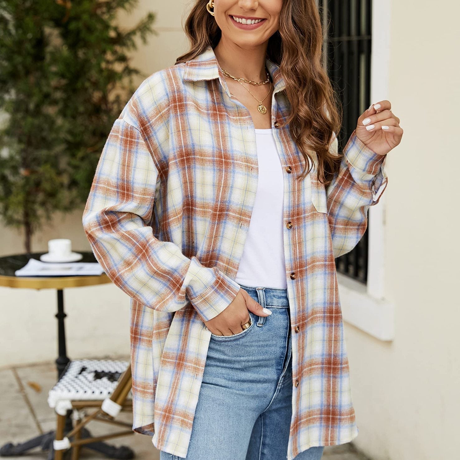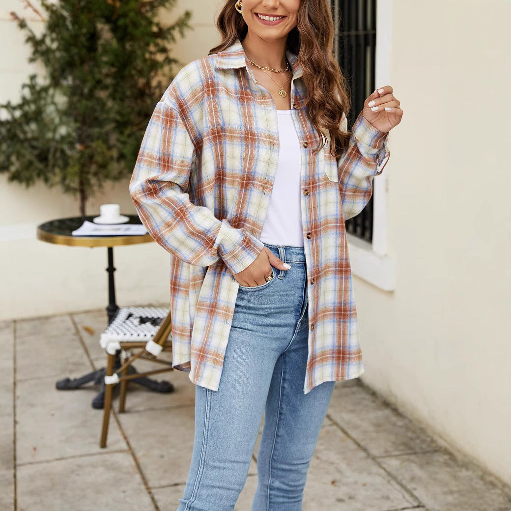This women’s mid-length shirt features a plaid pattern with a relaxed loose fit, designed with long sleeves and a traditional button closure. A front pocket detail adds practicality while enhancing its classic appeal. Available in multiple color options, it can be worn on its own or layered as an overshirt, making it a versatile addition to everyday wear.
