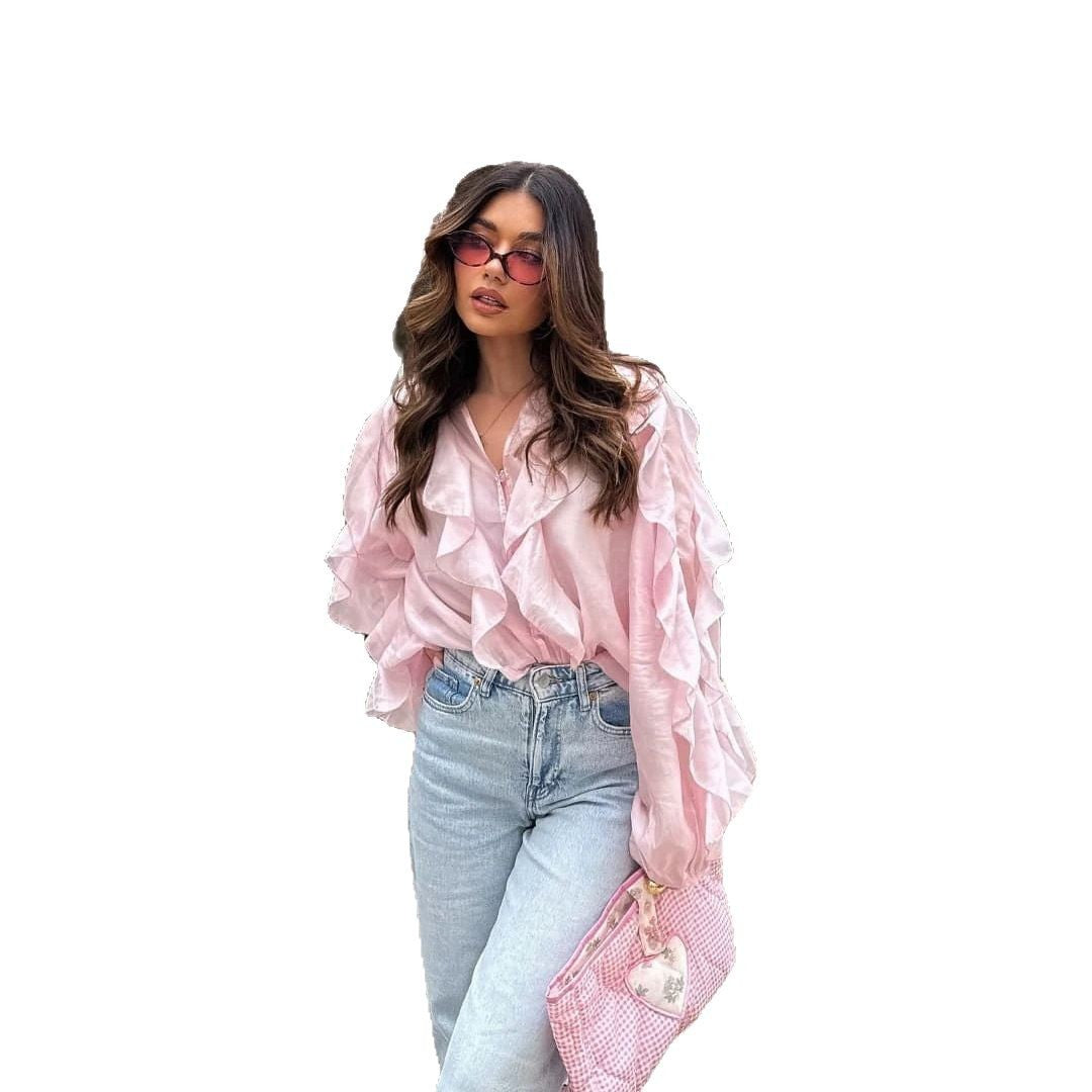 This women’s blouse features a loose silhouette with soft ruffle details, adding a refined touch to a classic design. The round neck and long sleeves make it versatile for pairing with skirts, trousers, or layering under jackets. Available in pink and white, it offers an adaptable option for both everyday and office wear.