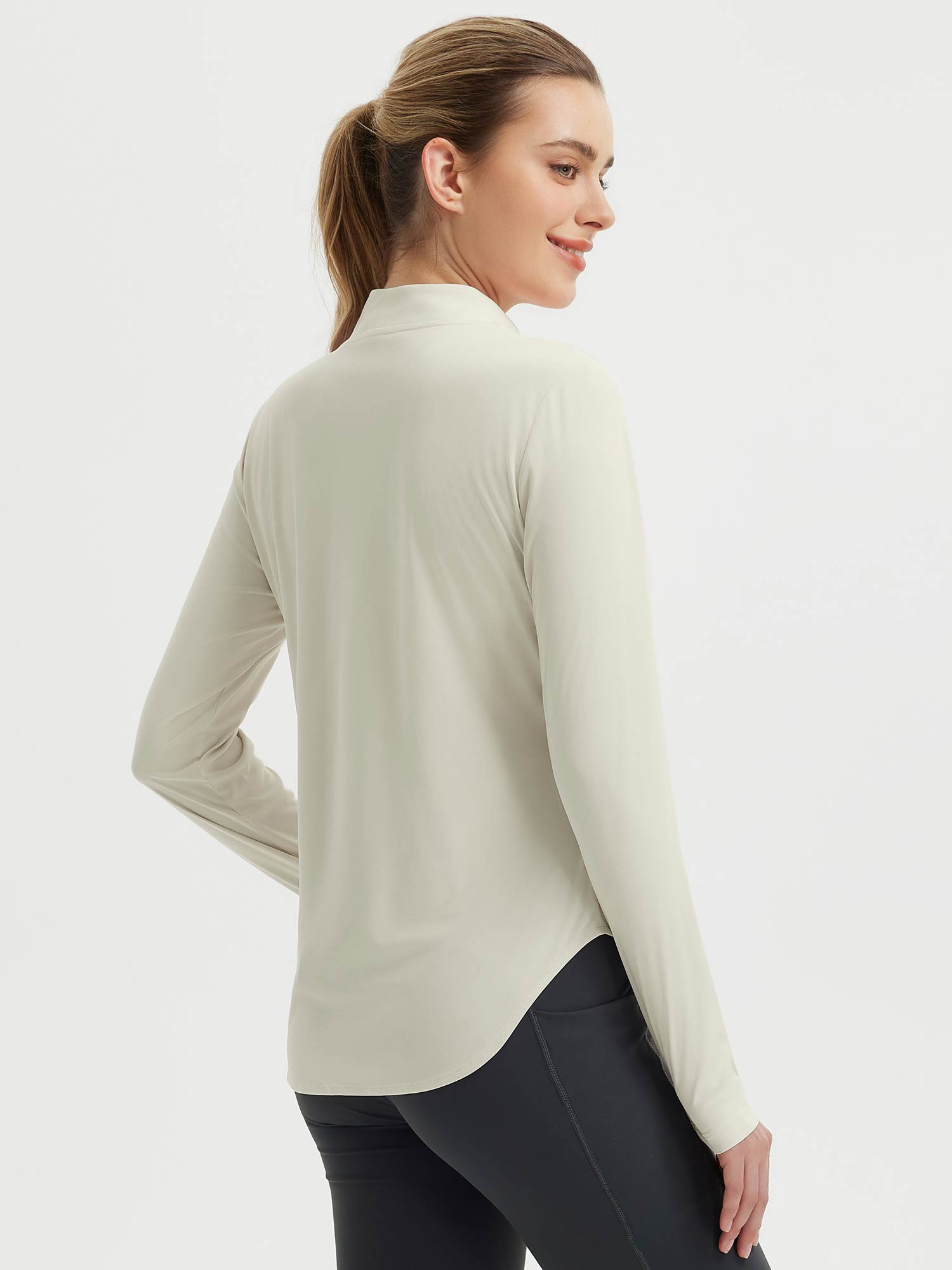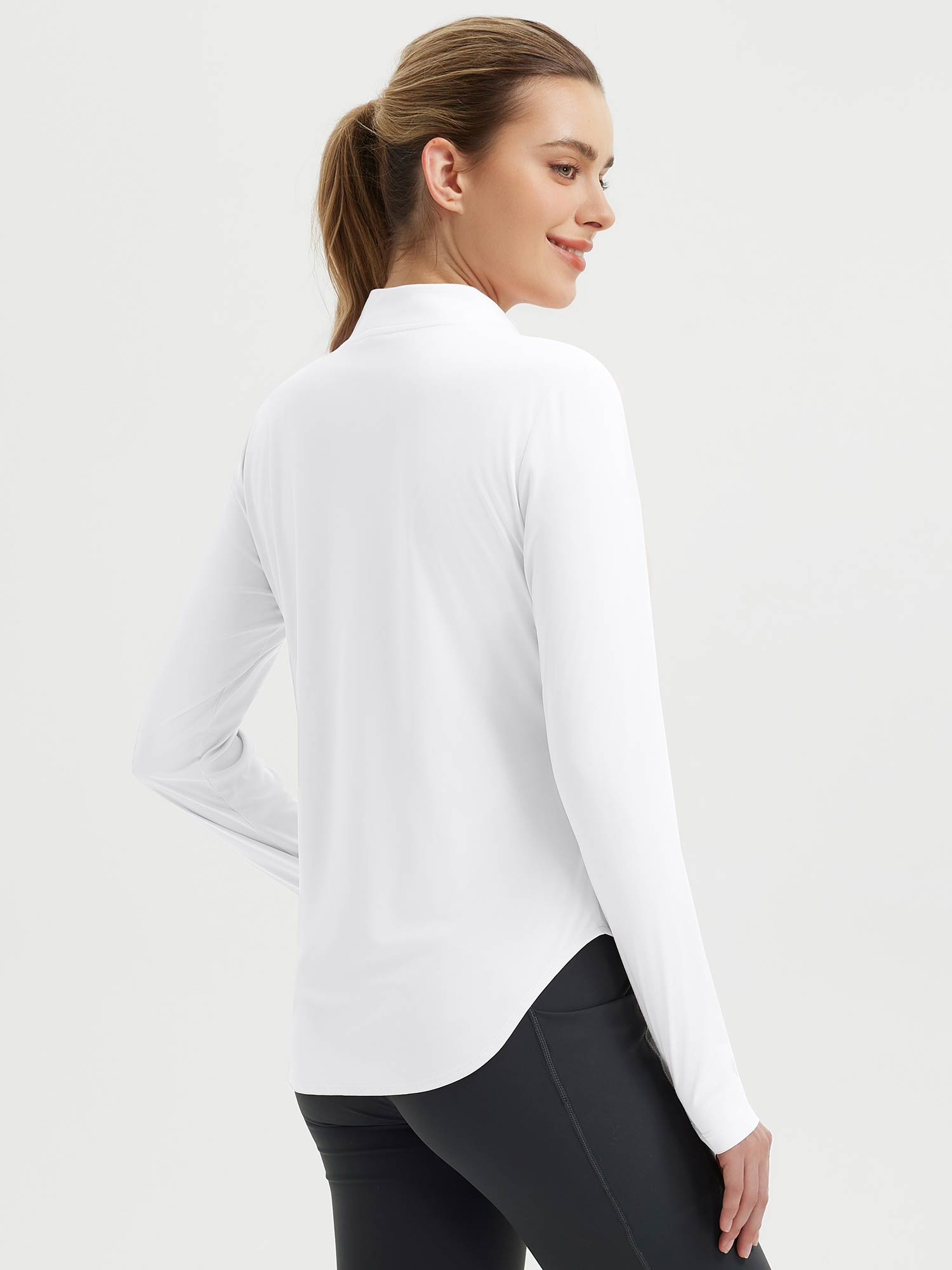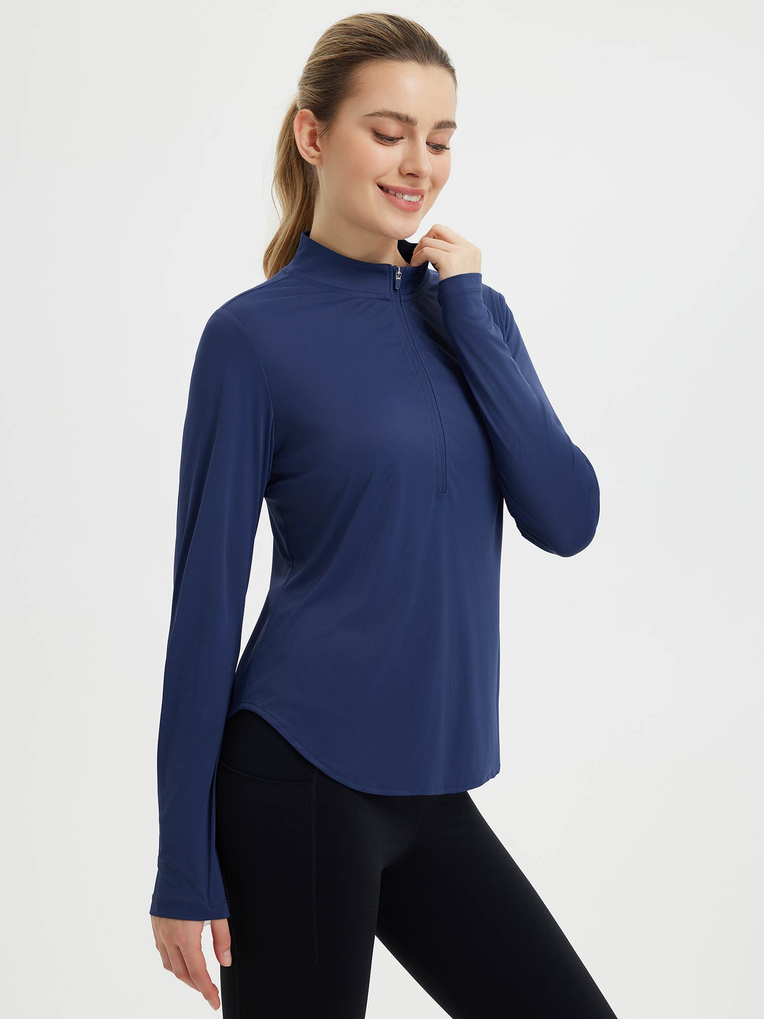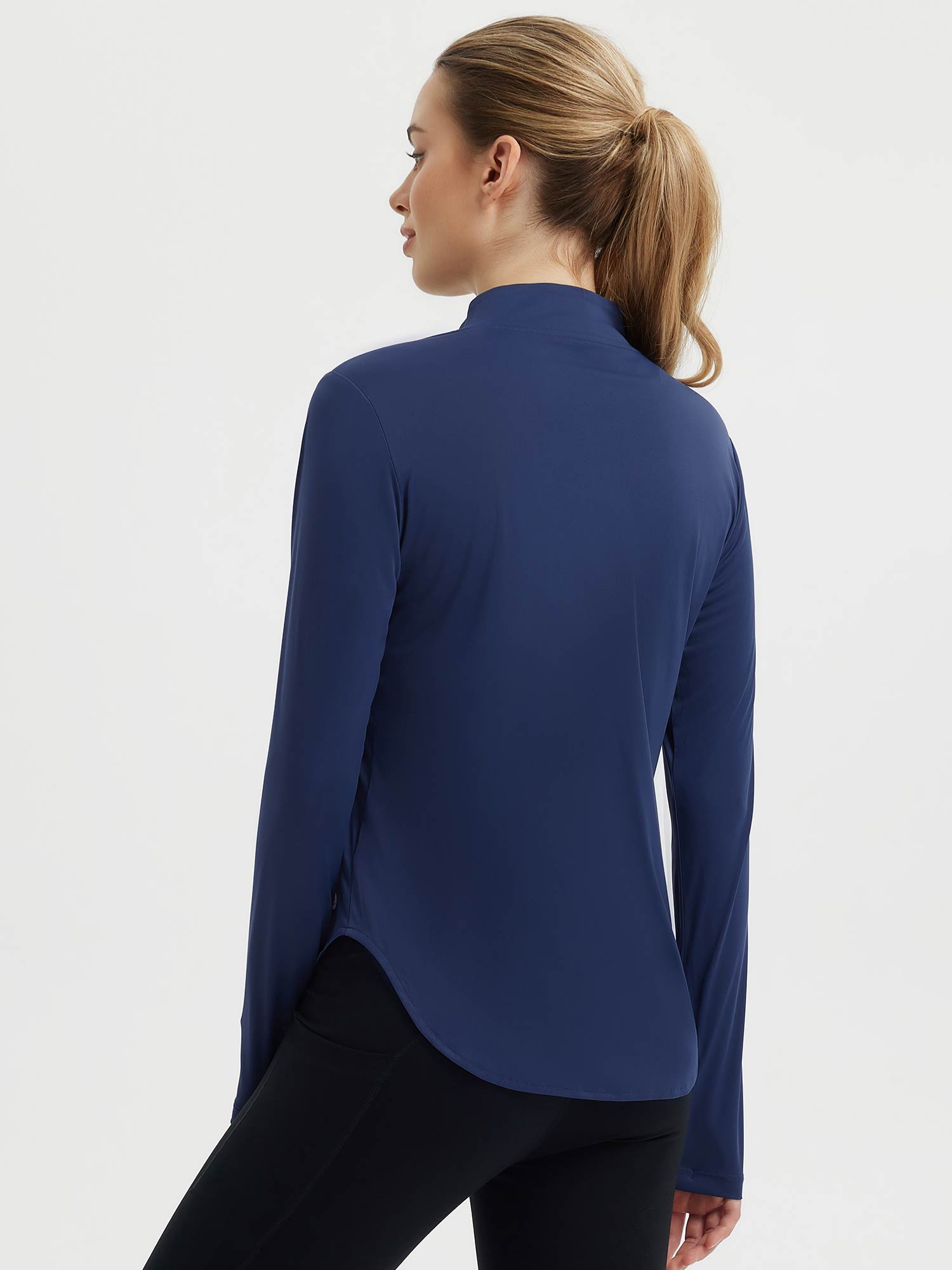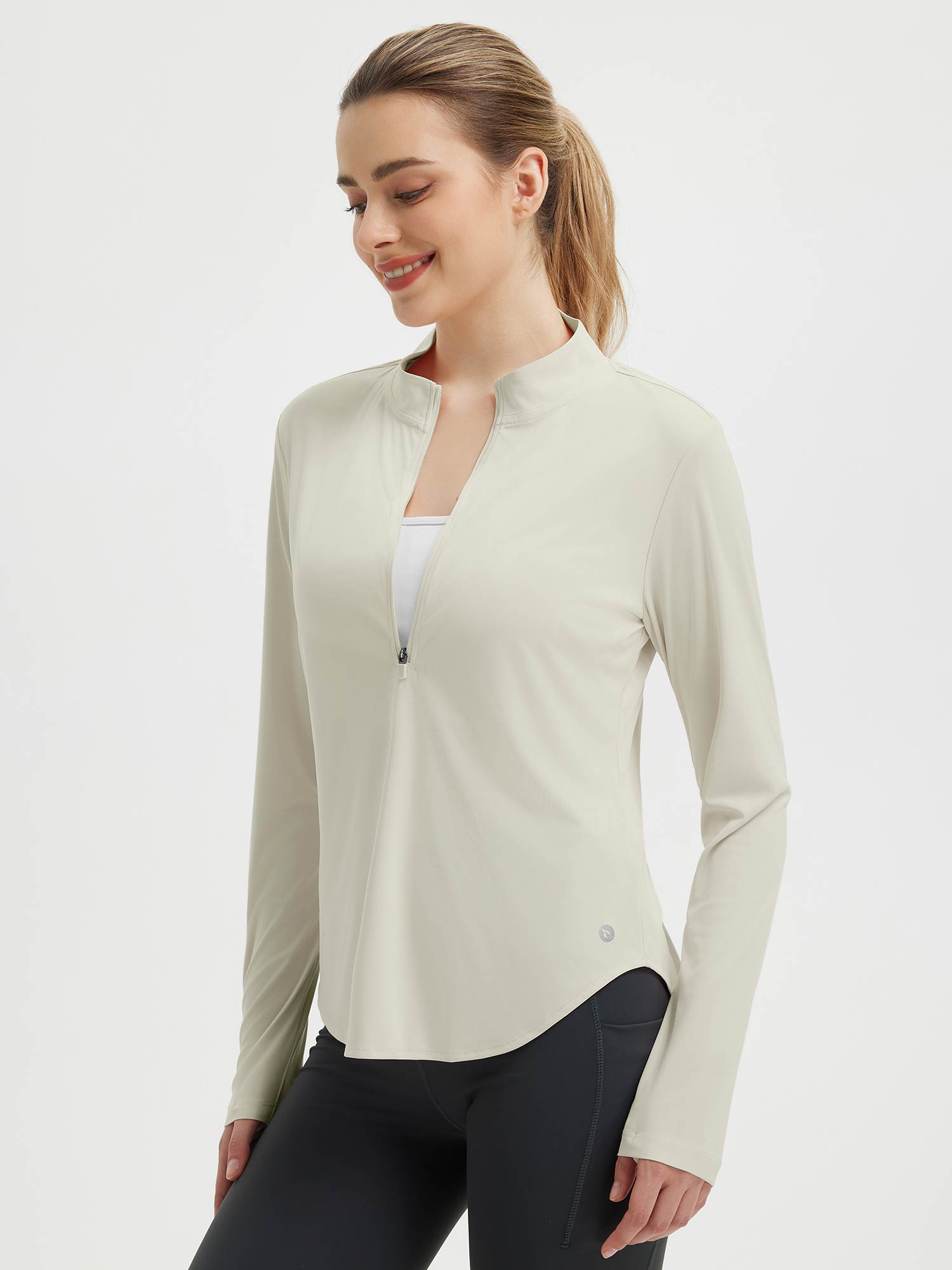 This women’s long sleeve tee is designed for outdoor activities with sun protection and lightweight construction. The rounded hem allows greater freedom of movement, while the thumbholes provide extra sleeve coverage. Featuring an almost half-zip closure and a princess line for better body fit, this tee offers ventilation and ease of wear. Ideal for running, hiking, golfing, or other active pursuits, it provides sun protection and mobility in a single performance-ready design.